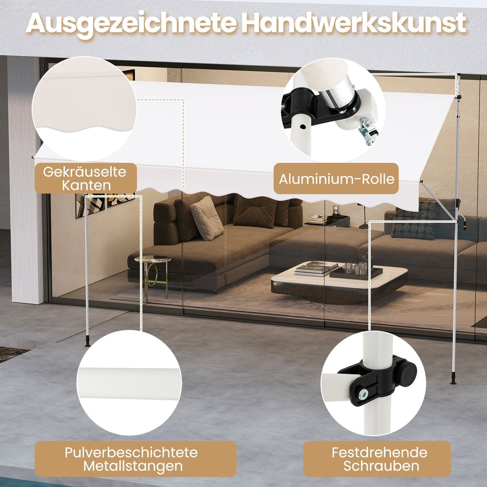 - Reguliuojamas aukštis (210–300 cm) ir kampas (0–180°) leidžia pritaikyti pavėsį pagal Jūsų poreikius.
