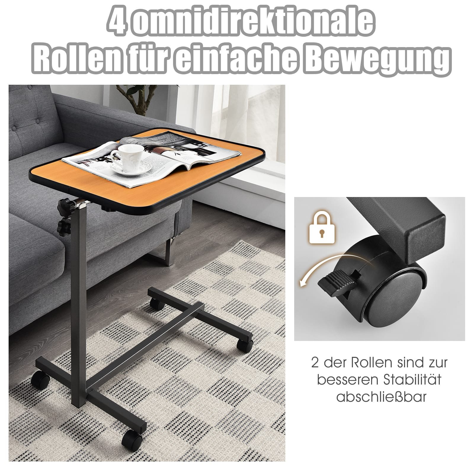Šis daugiafunkcis staliukas yra nepakeičiamas pagalbininkas kasdienai. Dėl reguliuojamo aukščio ir manevringų ratukų, jis puikiai tinka darbui ar poilsiui prie sofos, lovos ar kitur. Tvirta konstrukcija ir lengvai prižiūrimas paviršius garantuoja ilgalaikį naudojimą bei komfortą.