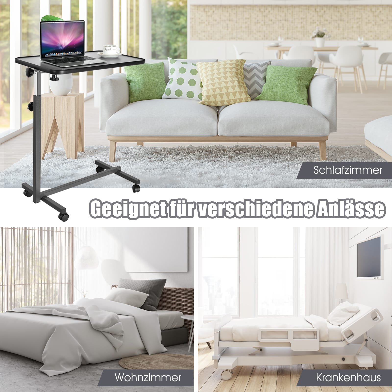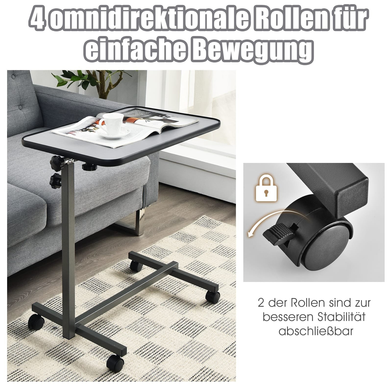Šis daugiafunkcis nešiojamojo kompiuterio staliukas sukurtas siekiant užtikrinti kasdienį patogumą ir lankstumą. Dėl reguliuojamo aukščio ir stalviršio kampo, jis puikiai tinka darbui ar poilsiui ant sofos, lovoje ar bet kurioje kitoje vietoje. Įmontuoti ratukai su stabdžiais užtikrina lengvą perkėlimą ir stabilų fiksavimą, o patvarios medžiagos garantuoja ilgaamžiškumą.