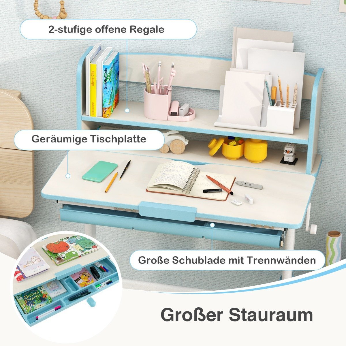 Reguliuojamo aukščio rašomasis stalas su pakreipiamu stalviršiu ir stalčiumi (Mėlyna)