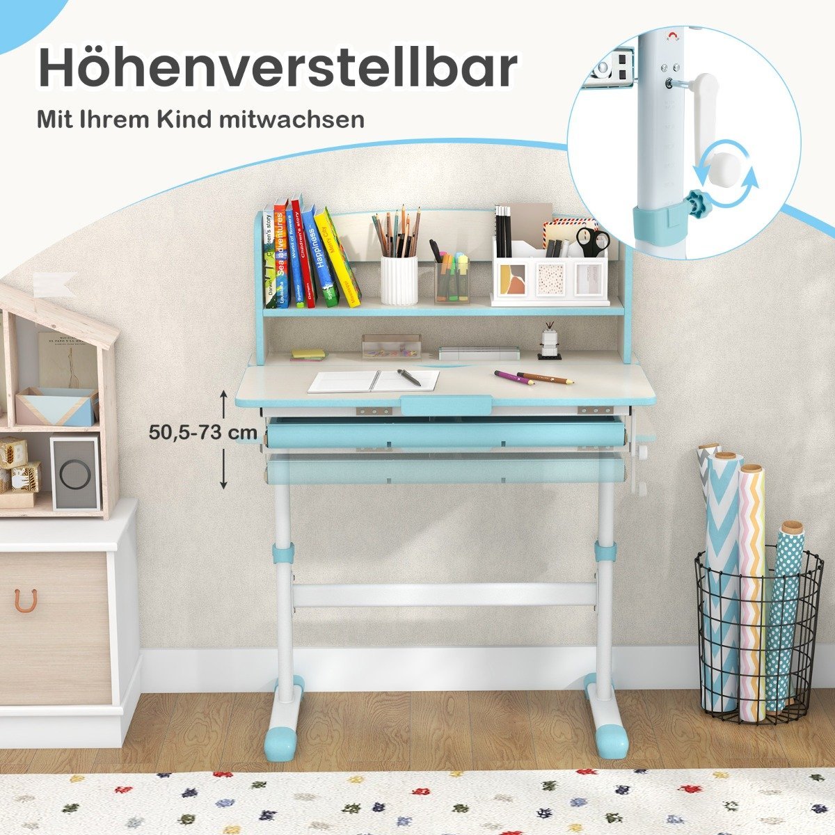 Šis aukščiui reguliuojamas stalas sukurtas vaikams nuo 3 iki 12 metų, prisitaikydamas prie jūsų vaiko augimo ir poreikių. Pakreipiamas stalviršis skatina taisyklingą laikyseną ir padeda patogiau skaityti, rašyti ar piešti. Integruota liniuotė leidžia lengvai atlikti matavimus piešiant ar ruošiant namų darbus. Dėka talpaus stalčiaus ir lentynų, darbo vieta išlieka tvarkinga.