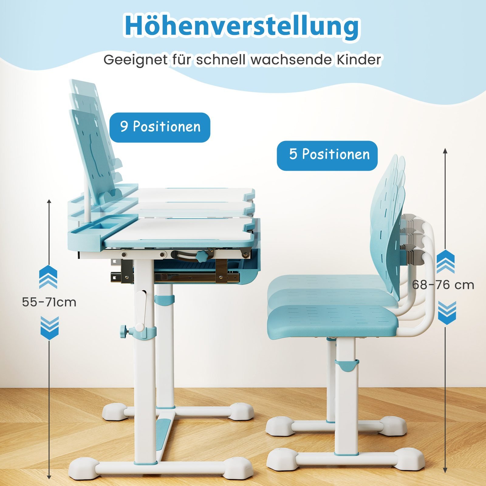 Reguliuojamo aukščio rašomasis stalas su pakreipiamu stalviršiu vaikams (Mėlyna)