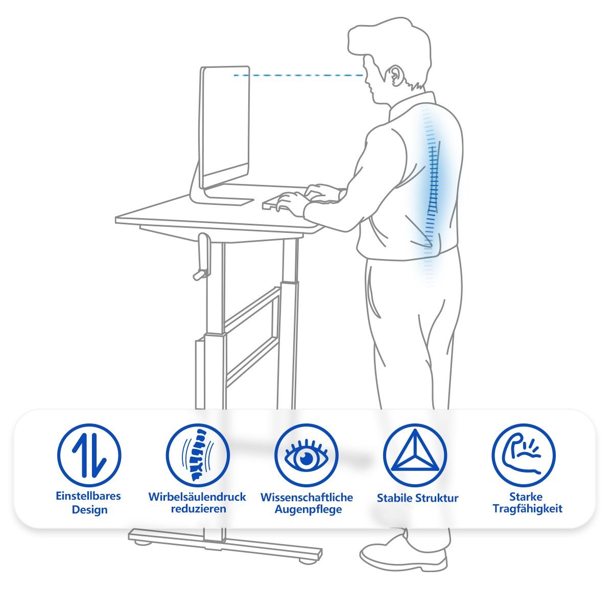 - Reguliuojamas aukštis nuo 75 cm iki 113 cm, leidžiantis dirbti patogiai sėdint ar stovint.