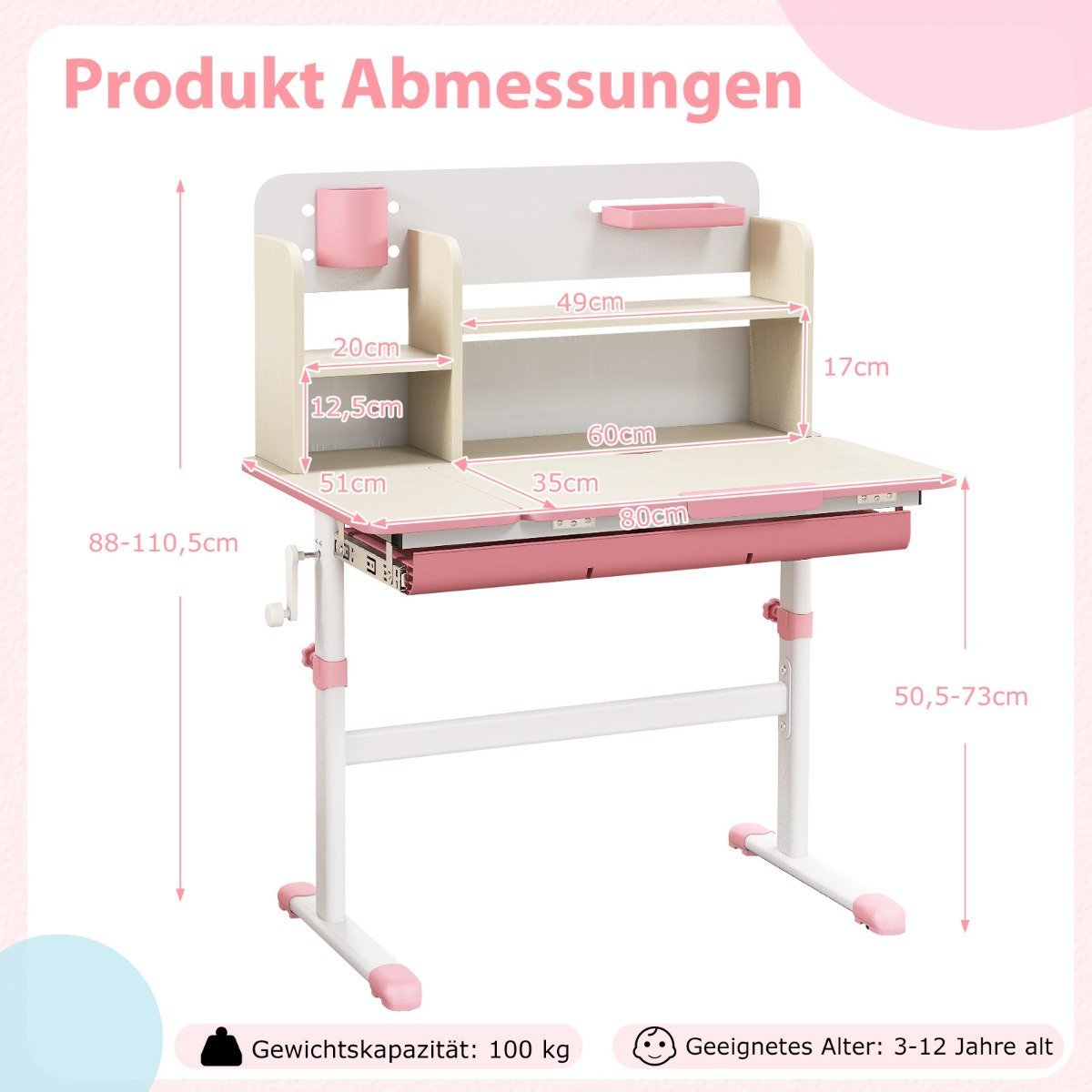 Reguliuojamo aukščio vaikiškas rašomasis stalas su pakreipiama darbine plokšte (Rožinė)
