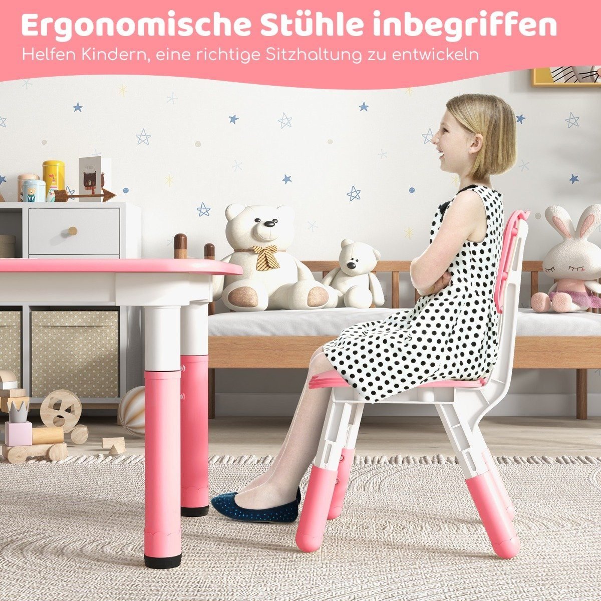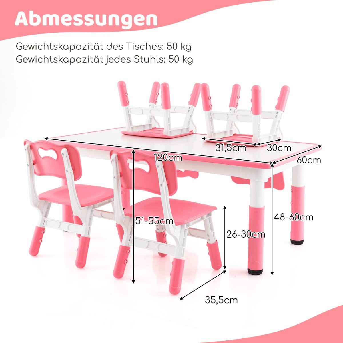 - Reguliuojamas aukštis leidžia lengvai pritaikyti stalą ir kėdes pagal vaiko ūgį.