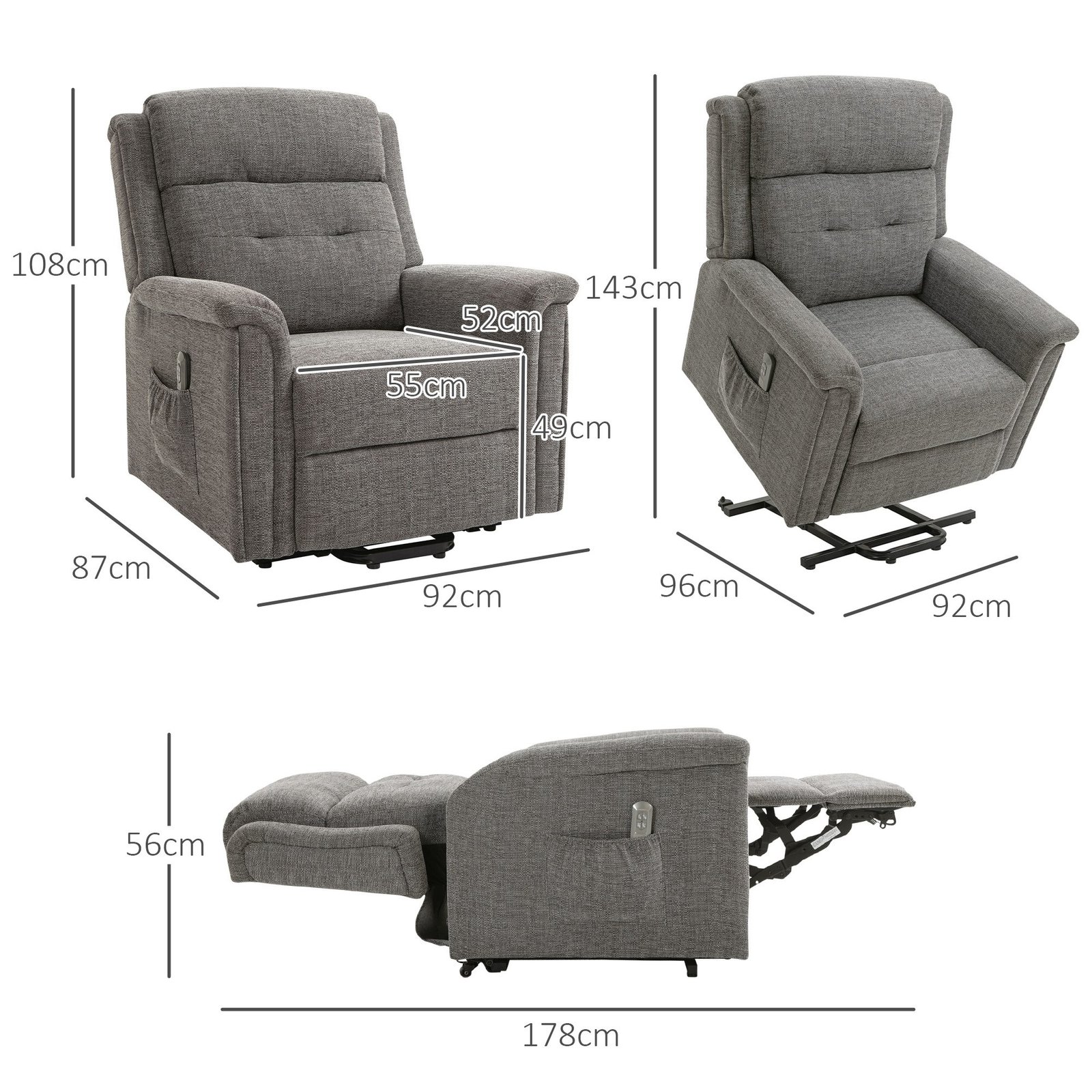 Paspaudus mygtuką, šis patogus poilsio krėslas tampa atsistojimo pagalbine priemone, kuri padeda jums atsistoti ir atsisėsti. Praktinės šoninės kišenės suteikia vietos nuotolinio valdymo pultams ir žurnalams. Atlošą galima atlenkti iki 180° ir nustatyti į gulimą padėtį. Šiame krėsle galite patogiai žiūrėti televizorių, atsipalaiduoti ir pailsėti. Integruota kojų atrama suteikia papildomo komforto.