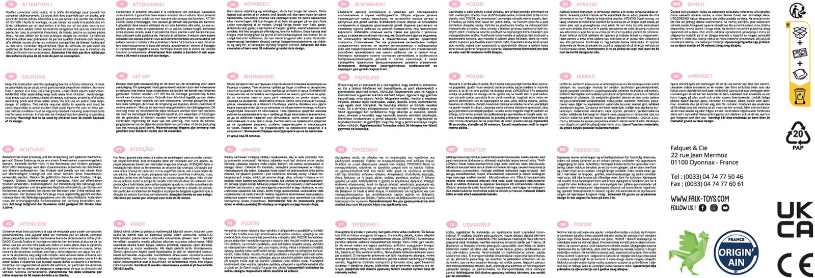 „Falk“ yra pirmaujantis Europos aukštos kokybės minamų transporto priemonių gamintojas. Įmonės asortimente – traktoriai su tokių prekių ženklų kaip „Claas“, „Renault“, „McCormick“, „Kubota“, „Case IH“ ir kitų licencijomis. Visos transporto priemonės gaminamos Prancūzijoje iš aukštos kokybės medžiagų.