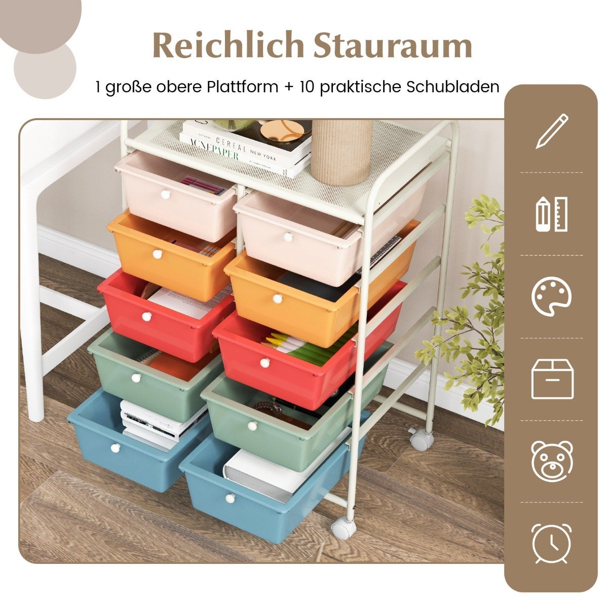 Ieškote praktiško ir stilingo sprendimo daiktams tvarkyti? Šis 10 stalčių riedantis laikymo vežimėlis – puikus pasirinkimas tiek darbui, tiek namams. Jame derinama erdvi platforma ir išimami stalčiai, leidžiantys efektyviai organizuoti įvairius daiktus: nuo biuro reikmenų iki įrankių ar meno reikmenų.