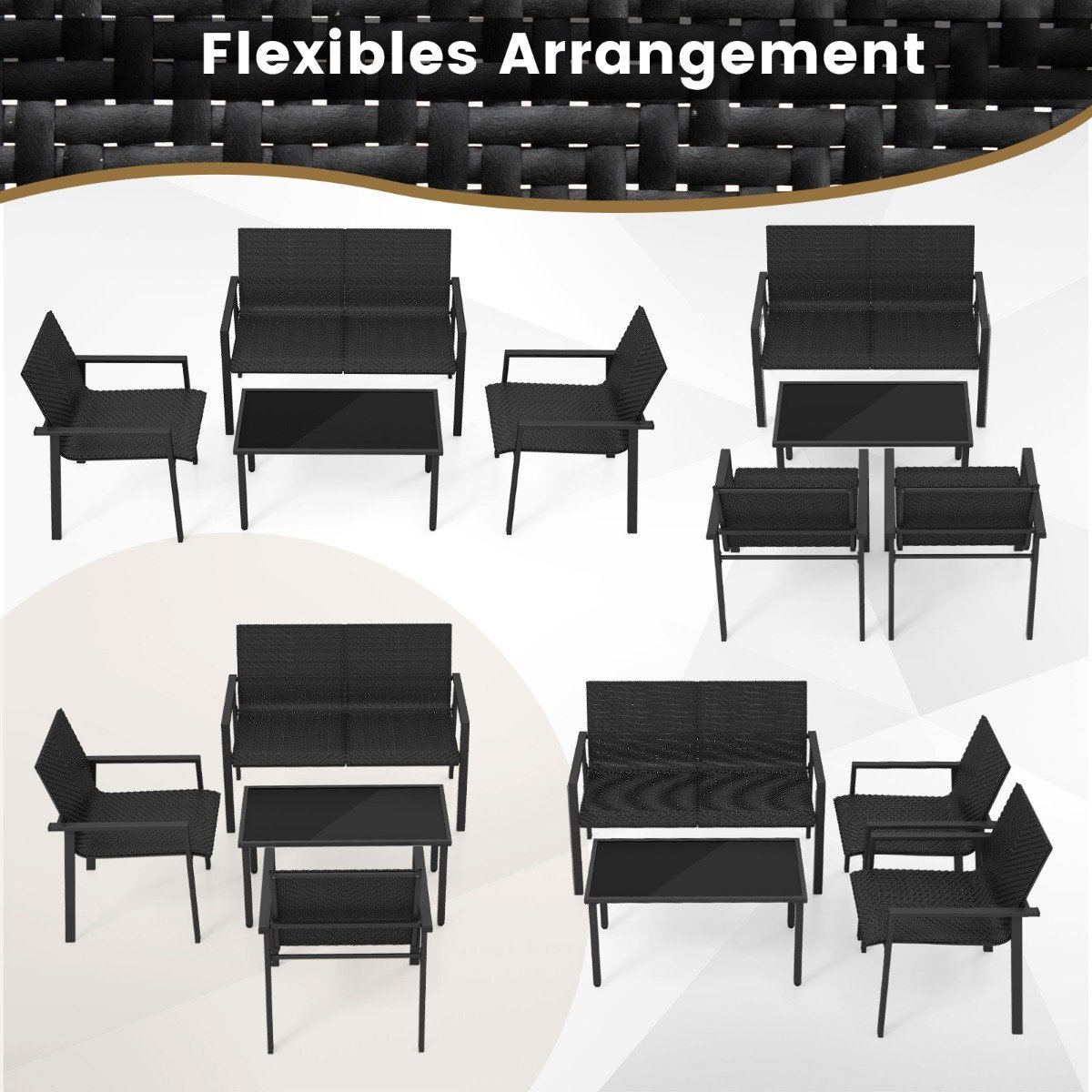 Rinktinis lauko baldų komplektas: 2 kėdės suolas staliukas (Juoda)
