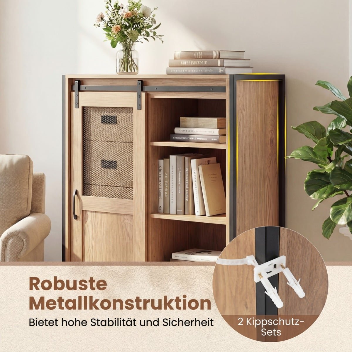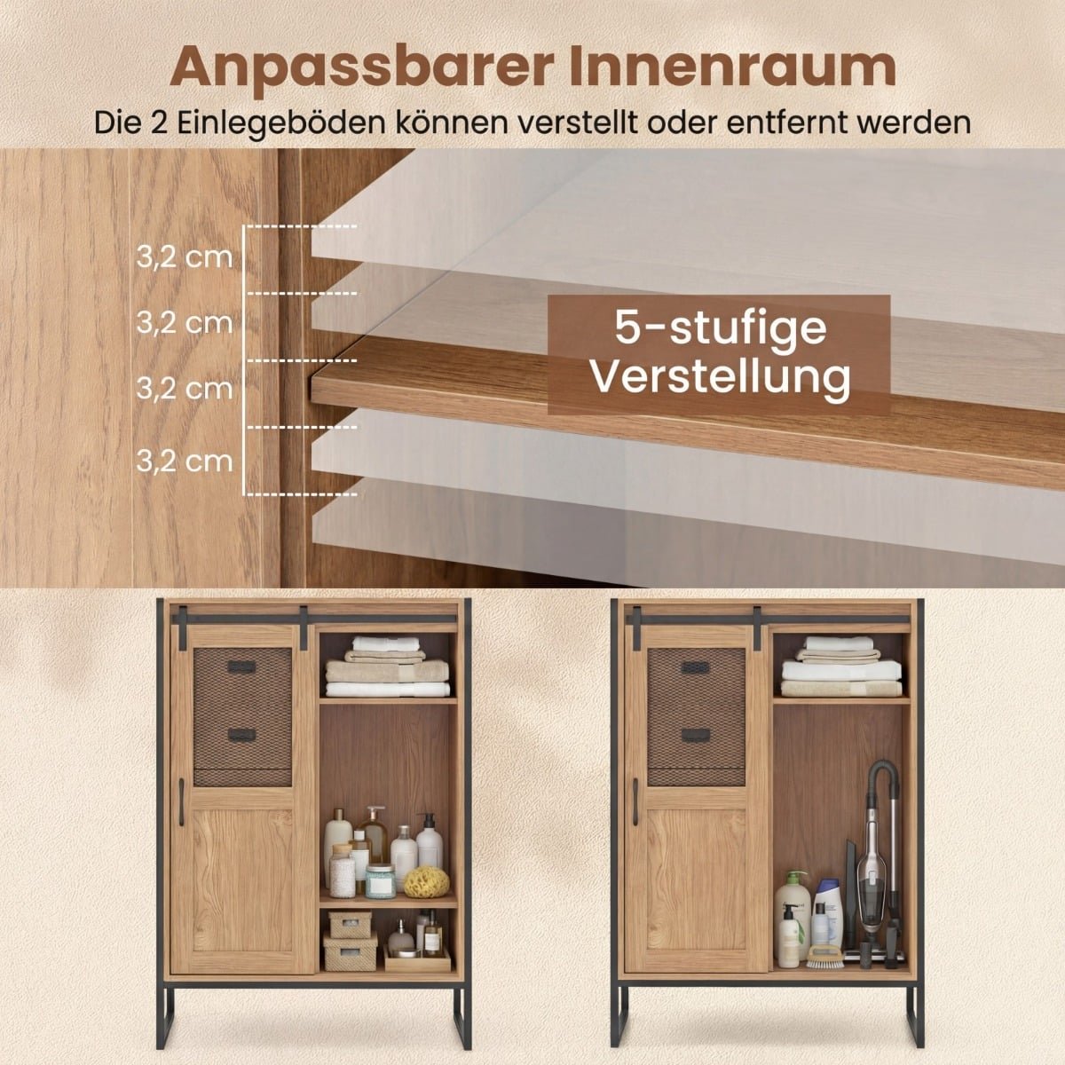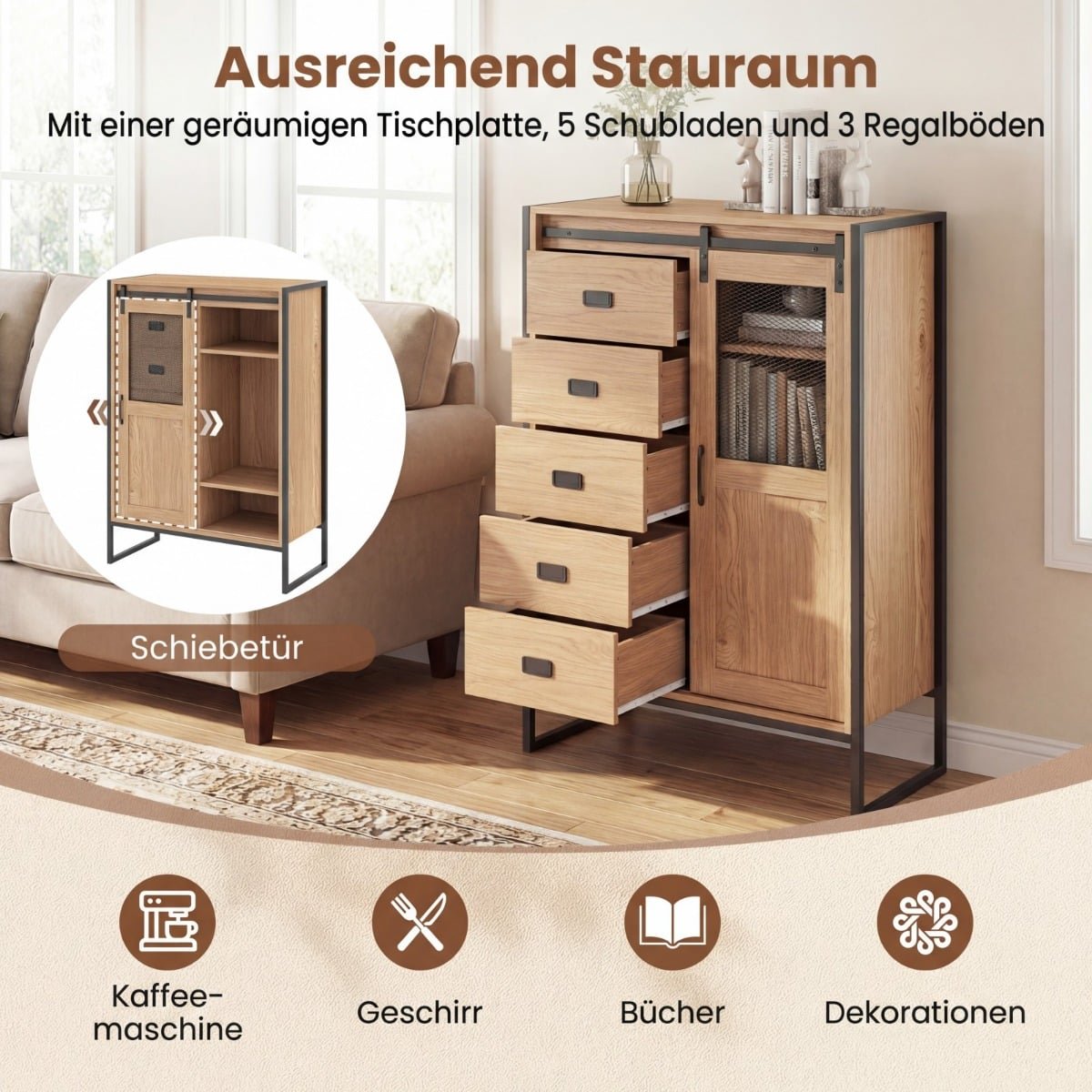 Atsisveikinkite su netvarka ir mėgaukitės tvarkinga aplinka su šia universalia bei stilinga komoda, kuri puikiai papildys jūsų namų erdvę. Ši grindinė spintelė siūlo erdvią viršutinę plokštumą, 5 stalčius ir 3 reguliuojamas bei išimamas lentynas, puikiai tinkančias įvairaus dydžio daiktams laikyti. Be to, vietą taupančios stumdomos durys su metaliniu tinkleliu ne tik užtikrina ventiliaciją, bet ir leidžia lengvai matyti turinį, o tvirta metalinė konstrukcija garantuoja patikimą ilgaamžiškumą bei saugumą.
