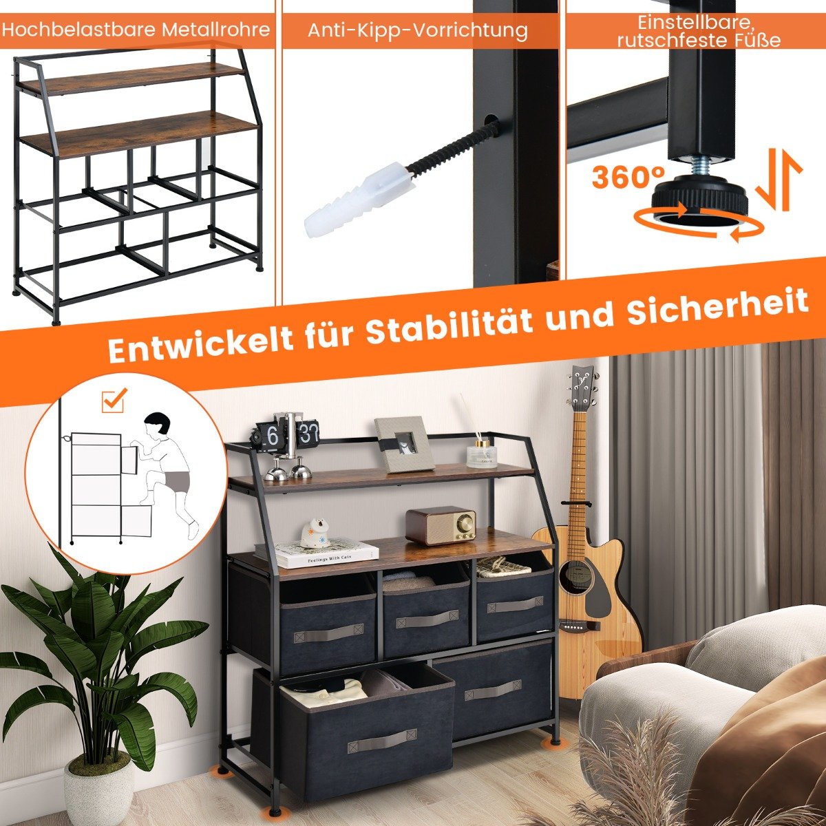 Šis 5 stalčių komodos organizatorius su viršutine lentyna padės sukurti tvarkingesnę erdvę. Su 5 skirtingų dydžių stalčiais, ši saugojimo spintelė puikiai tiks įvairioms smulkmenoms laikyti. Be to, viršutinis stalviršis ir lentyna idealiai tinka jūsų kolekcijoms ir dekoracijoms eksponuoti.