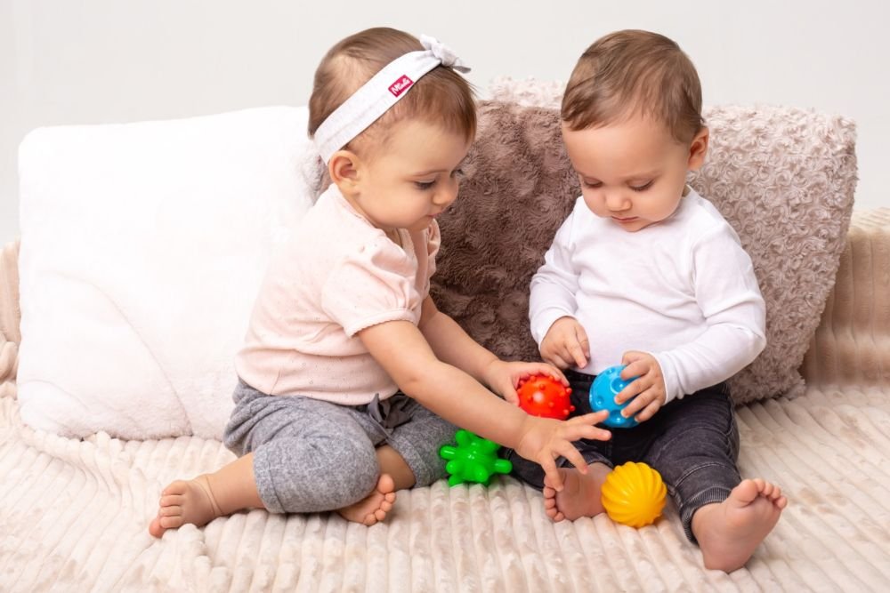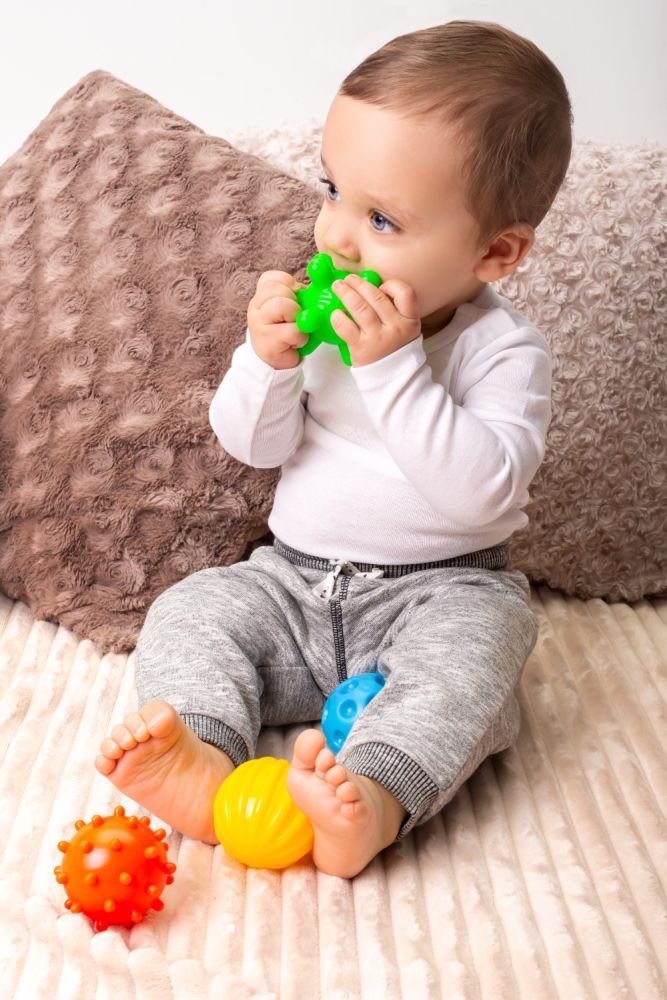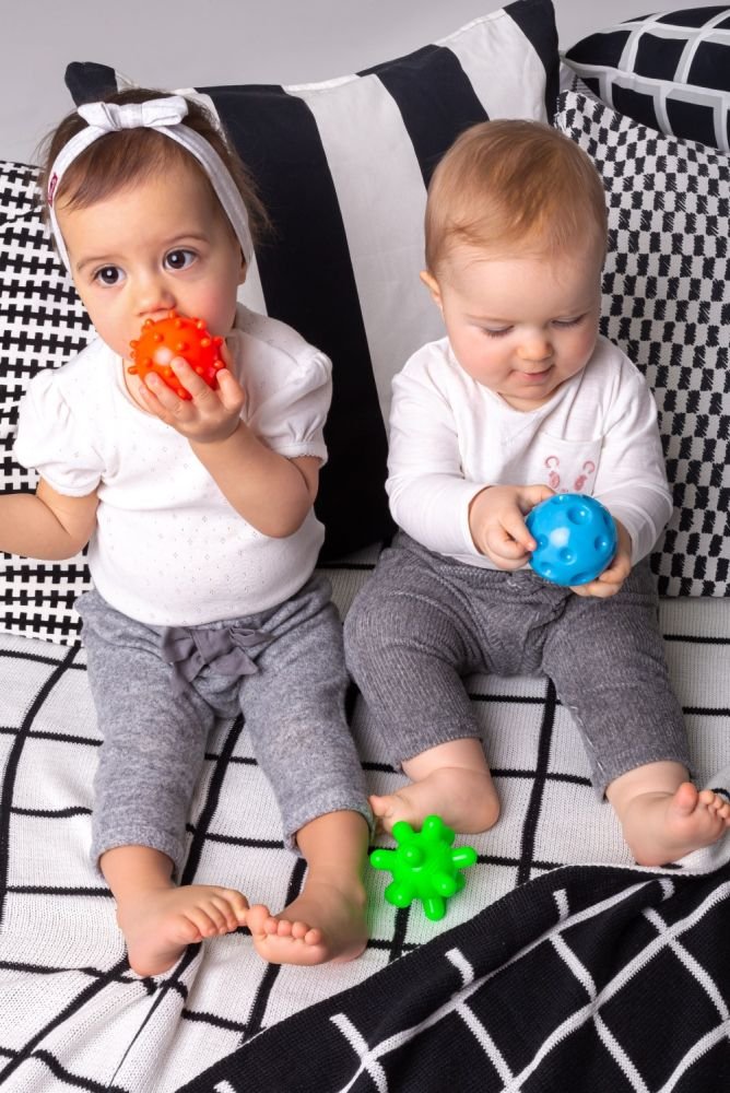 Keturių sensorinių kamuoliukų rinkinys, skirtas kūno masažui, reabilitacijai, gimnastikai ar net maudynėms. Dėl įvairių tekstūrų, spalvų ir svorių jie lavina vaikų pojūčius, stiprina potyrius ir leidžia užsiimti įvairia veikla.