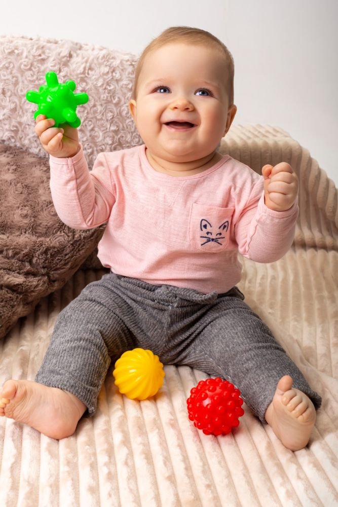 Rinkinį sudaro keturi spalvingi kamuoliukai. Kiekvienas jų turi skirtingą paviršių, svorį, o svarbiausia, kad ryškios ir įvairios spalvos patraukia mažylių dėmesį.
