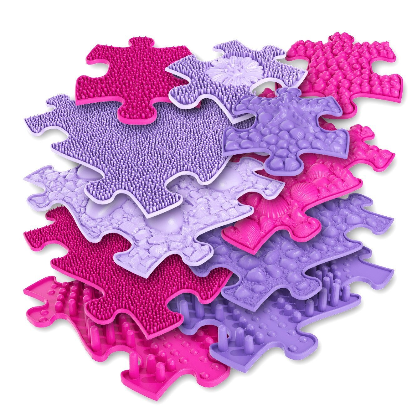 Šis sensorinis ortopedinis kilimėlis yra svarbus mažylio vystymuisi ir puiki pramoga vaikams, mėgstantiems vaikščioti basomis. Komplektą sudaro 11 dėlionių dalių, iš kurių 4 yra mažesnės. Detalės pasižymi skirtingomis kietomis ir minkštomis tekstūromis, kurios puikiai dera tarpusavyje. Kilimėlio paviršiai stiprina kūno centrą, gerina pusiausvyrą ir treniruočių stabilumą. Taip pat stiprinami čiurnų ir gilieji raumenys, padedantys išlaikyti taisyklingą laikyseną.