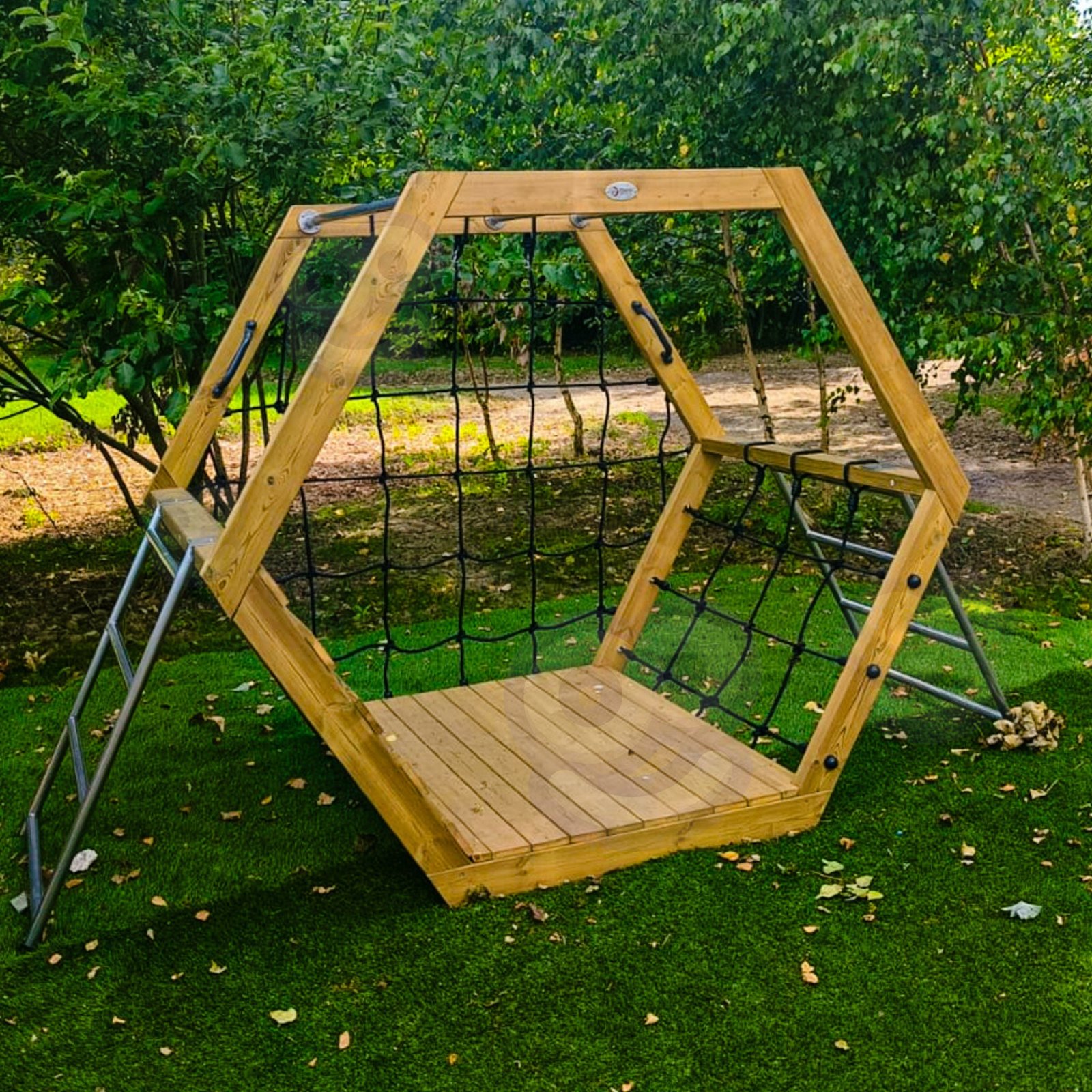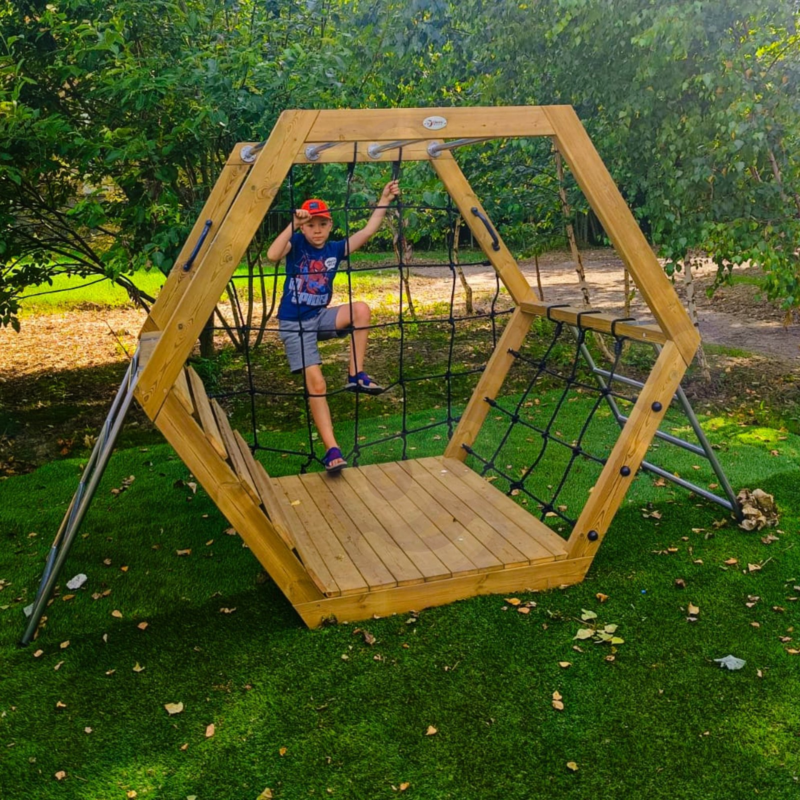 „Classic World Edu“ medinis šešiakampis laipiojimo ir žaidimų kompleksas – tai erdvė judėjimui, tyrinėjimui ir vaikų kūrybiškumo lavinimui. Pagamintas iš tvirtos medienos ir patvarių metalinių elementų, jis užtikrina saugumą ir ilgaamžiškumą net ir intensyviai žaidžiant. Ši konstrukcija sukurta vaikams, mėgstantiems laipioti, kabintis, ropoti ir kurti kliūčių ruožus. Dėl šešiakampės formos konstrukcija yra stabili ir patraukli, o įvairūs elementai skatina visapusišką veiklą.