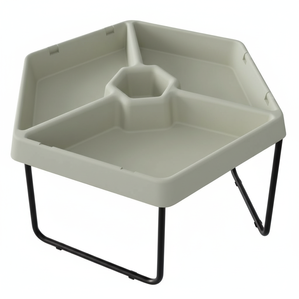 - Šešiakampis padėklas padalintas į 3 atskirus skyrelius, tinkamus skirtingoms veikloms ar darbui su keliomis medžiagomis vienu metu.