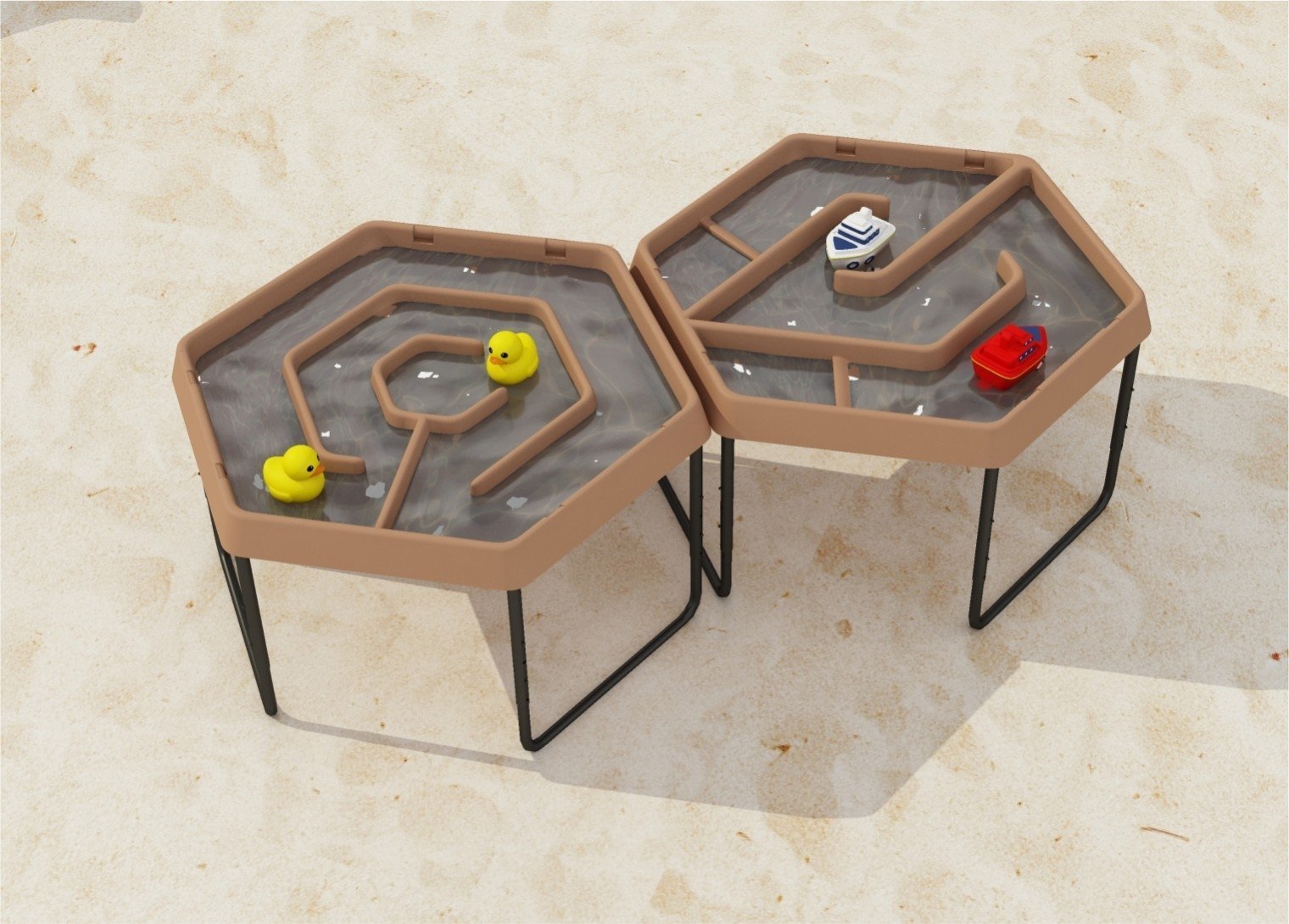 „Masterkidz“ šešiakampis vandens labirinto stalas – tai žaisminga erdvė, kurioje vaikai galės plukdyti laivelius ir ančiukus vingiuotais kanalais, stebėdami vandens tėkmę bei krypties pokyčius. Stabilus metalinis rėmas su reguliuojamu aukščiu ir padėklas su vandens takeliais užtikrina patrauklią bei erdvią vietą eksperimentams, teminiams ir bendriems žaidimams.
