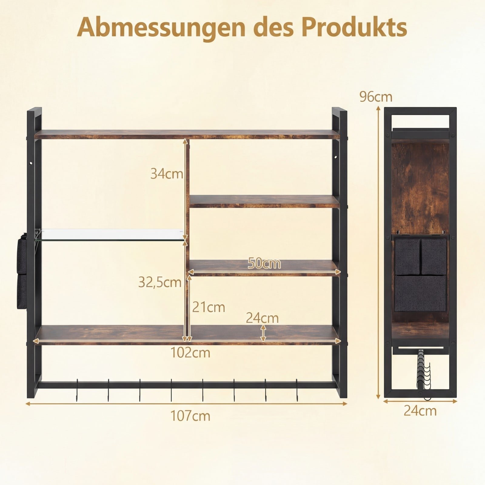 Atnaujinkite savo erdvę su šia stilinga pakabinama sienine lentyna. Pagaminta iš tvirto metalinio rėmo, patvarių medžio plokščių ir grūdinto stiklo lentynos, ji garantuoja ilgaamžiškumą. Šešios atviros lentynos, papildomi 8 S formos kabliukai ir šoninė kišenė suteikia gausybę vietos daiktams laikyti ir eksponuoti.