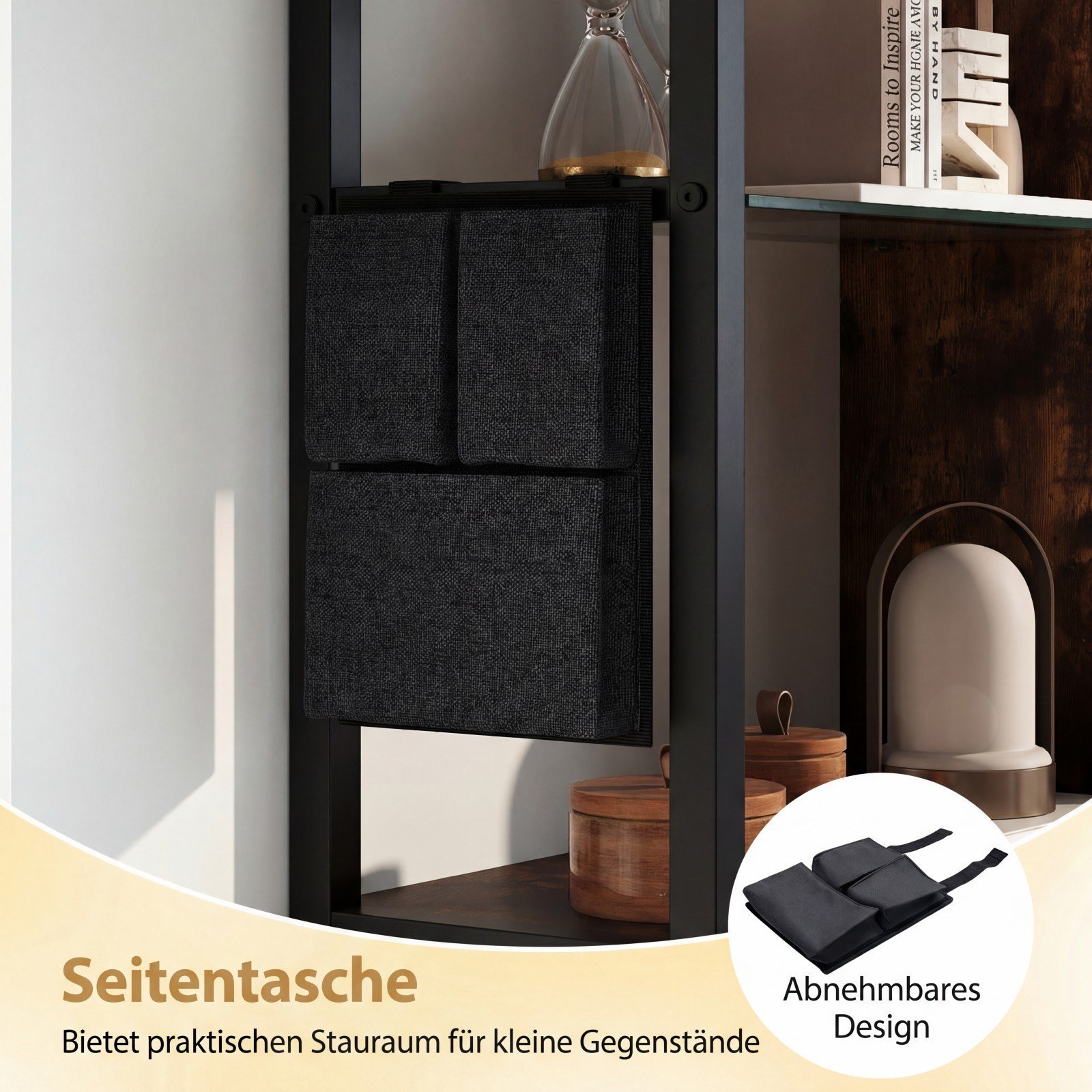 - Daug vietos daiktams: 6 atviros lentynos ir šoninė kišenė užtikrina saugų ir tvarkingą daiktų laikymą bei eksponavimą.