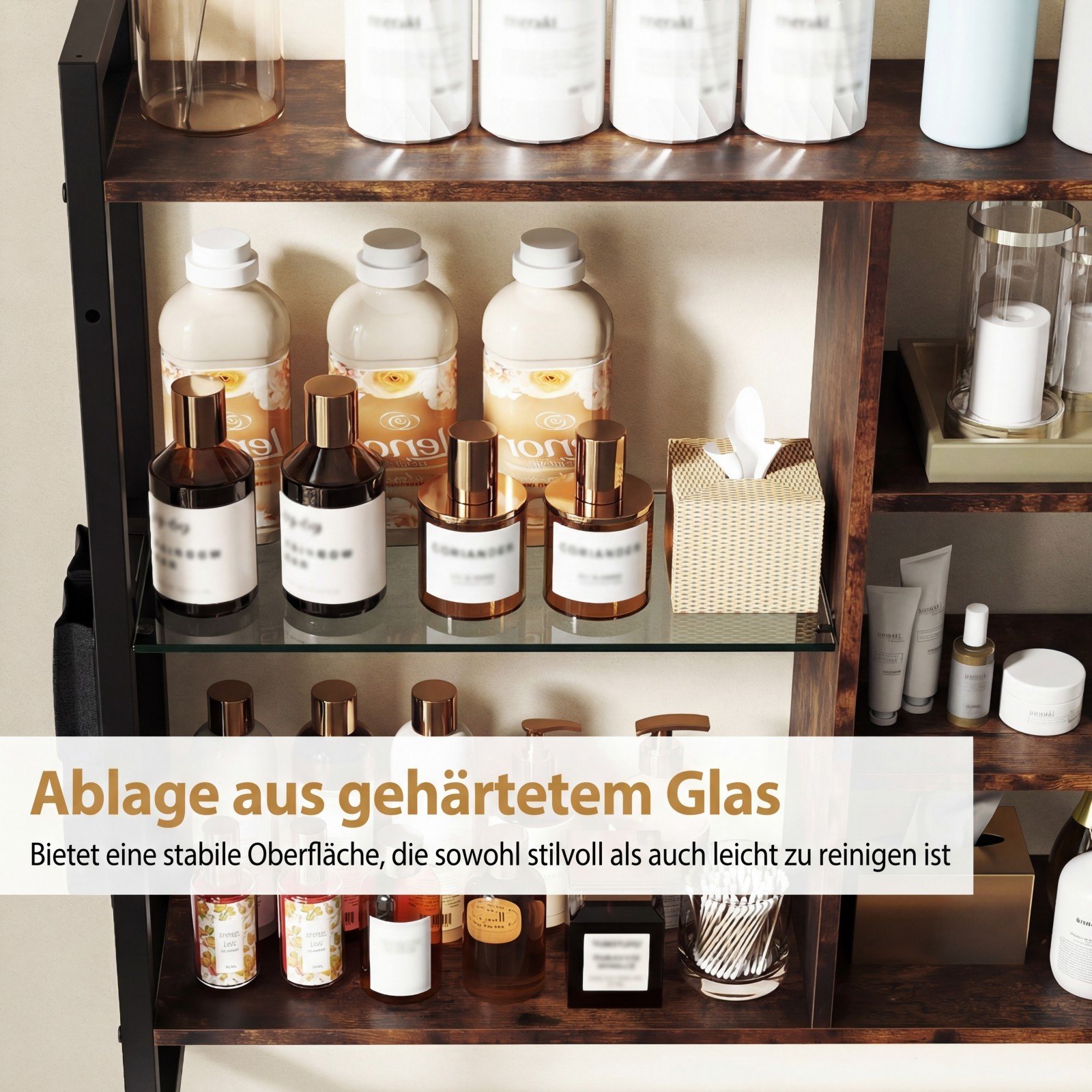 - Tvirta ir ilgaamžė konstrukcija: aukštos kokybės medžio plokštės, tvirtas metalinis rėmas ir grūdinto stiklo lentyna užtikrina išskirtinį stabilumą ir patvarumą.