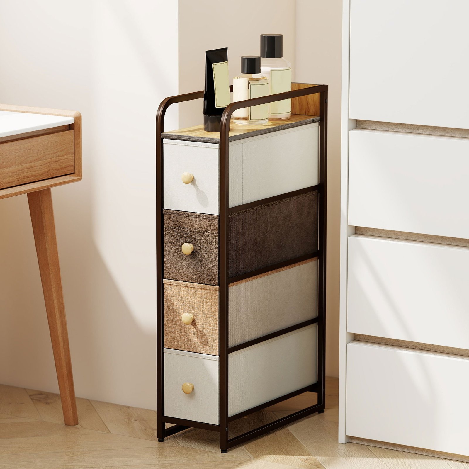Siaura komoda su 4 audinio stalčiais