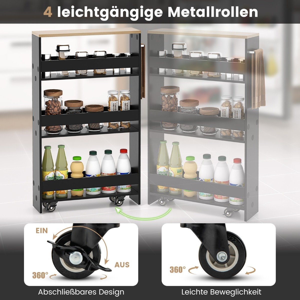 Šis funkcionalus ir kompaktiškas vežimėlis – puikus sprendimas jūsų namams! Su keturiomis skirtingomis lentynomis jis padeda tvarkingai laikyti įvairius daiktus: nuo virtuvės reikmenų iki biuro prekių.