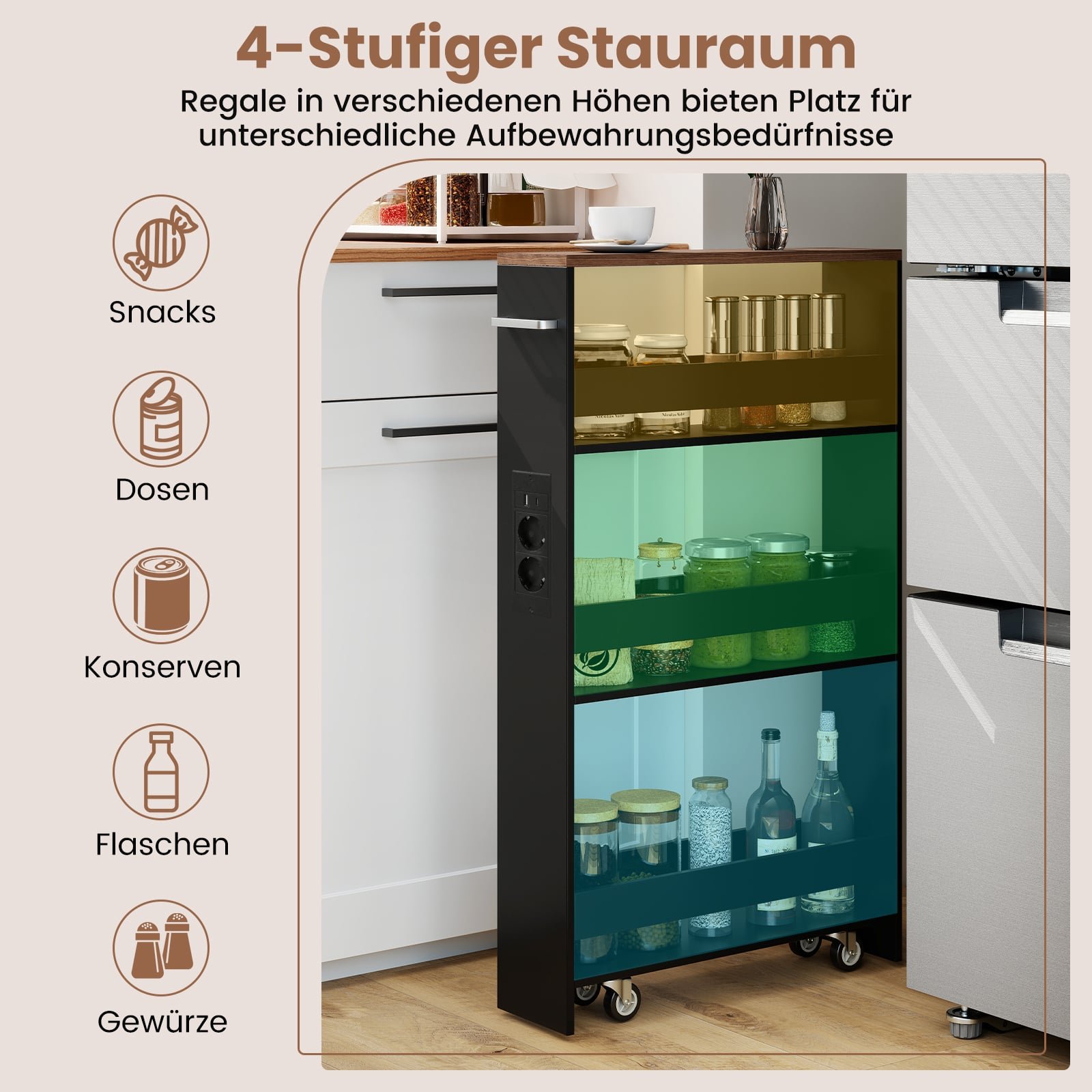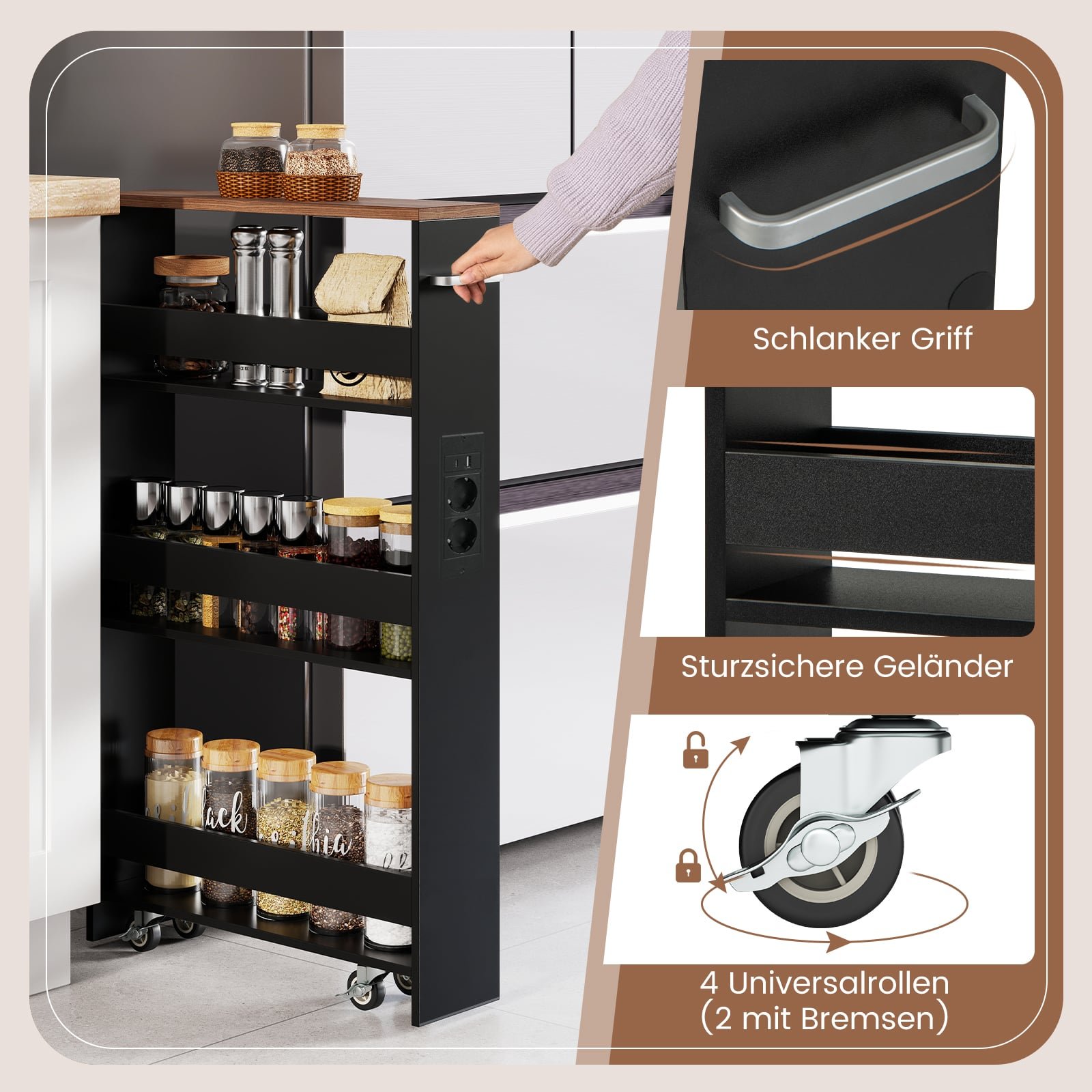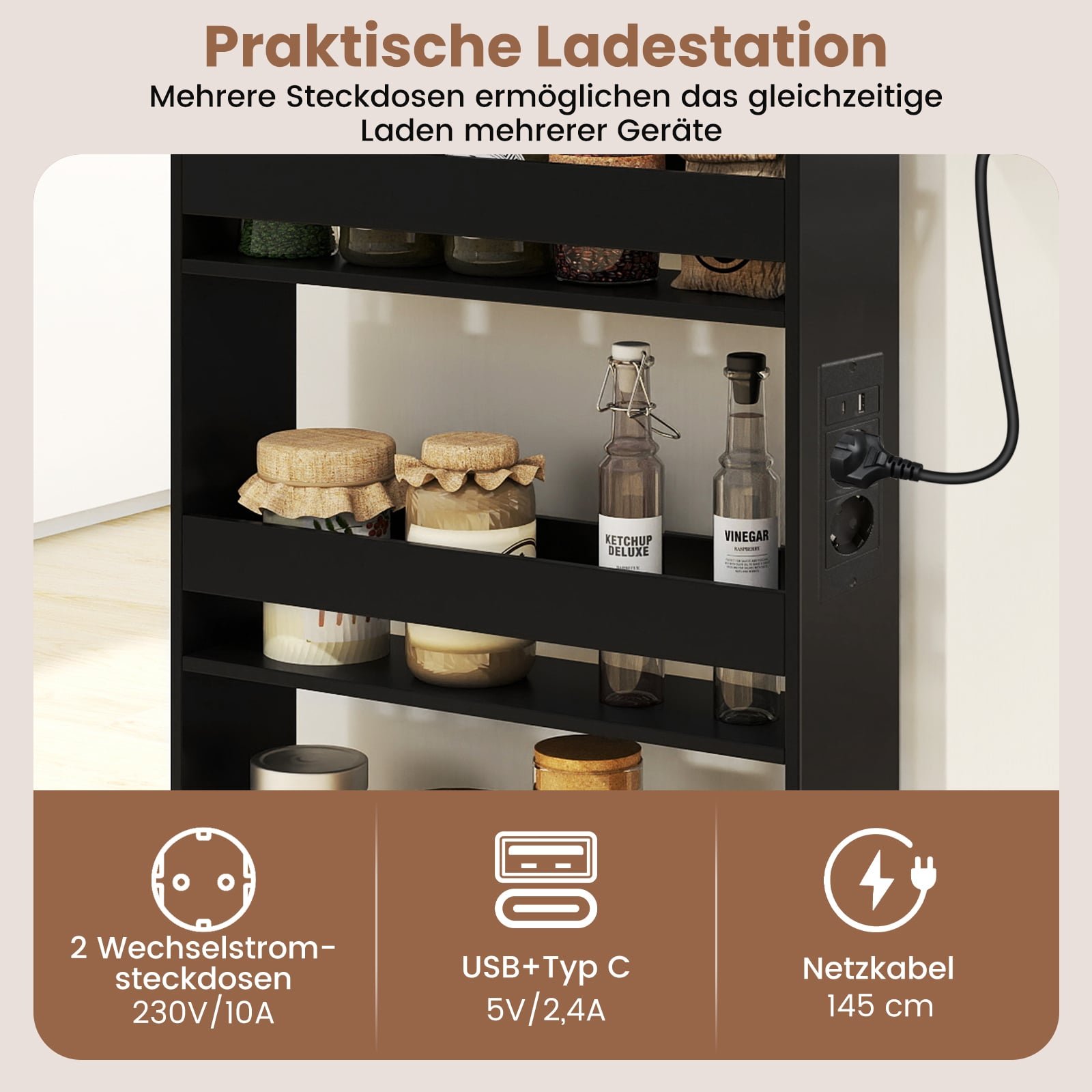 Transformuokite savo namų erdvę su šiuo itin siauru mobiliuoju lentyniniu vežimėliu, puikiai tinkančiu ankštoms erdvėms – pavyzdžiui, šalia šaldytuvo, tarp skalbimo mašinos ir džiovyklės ar siauruose kampuose. Jo sumanus 4 aukštų dizainas siūlo talpią vietą įvairiems daiktams – nuo virtuvės prieskonių iki skalbimo reikmenų. Integruota įkrovimo stotelė su AC, USB ir C tipo jungtimis užtikrins, kad Jūsų įrenginiai visada būtų įkrauti, o vežimėlį lengvai perkelsite dėka patogios rankenos ir sklandžiai riedančių ratukų. Pagamintas iš lengvai valomų medžiagų, šis kompaktiškas organizatorius yra ne tik stilingas, bet ir ilgaamžis.