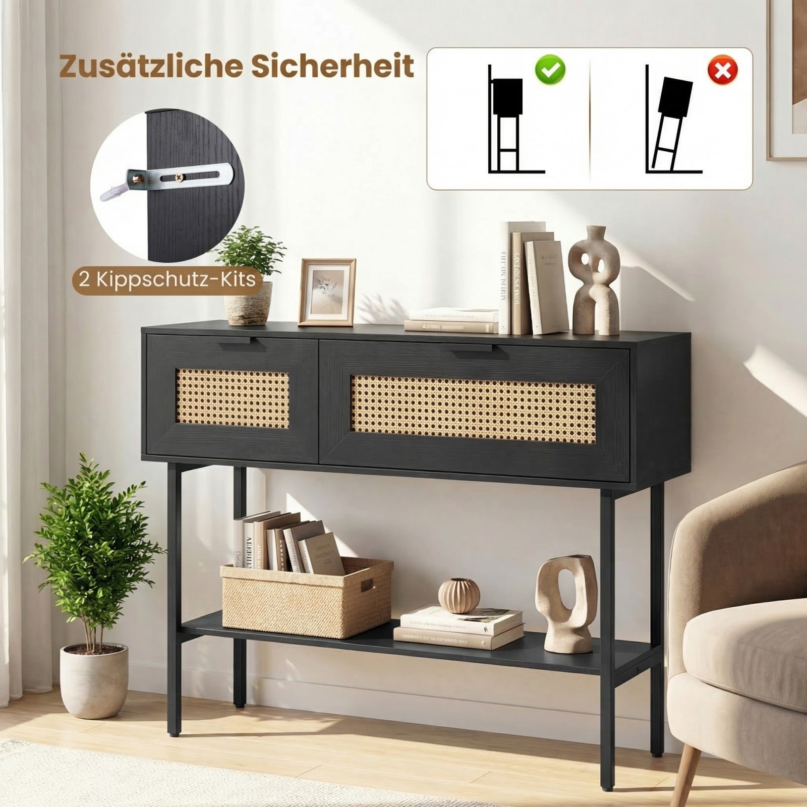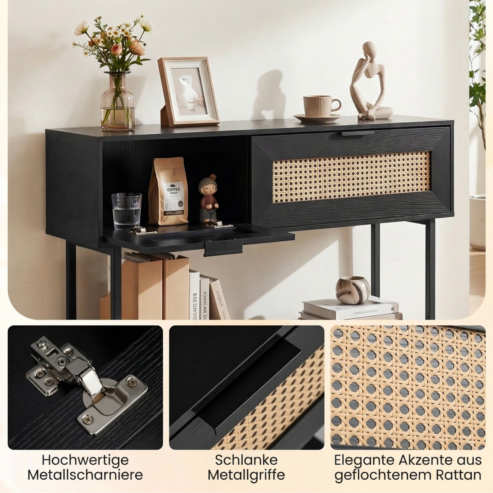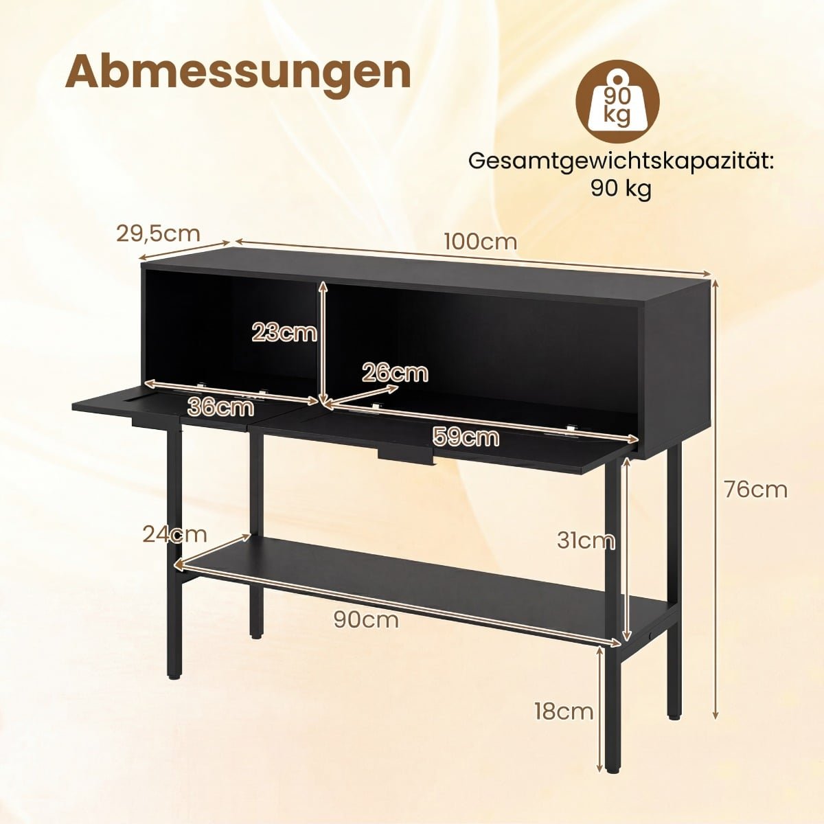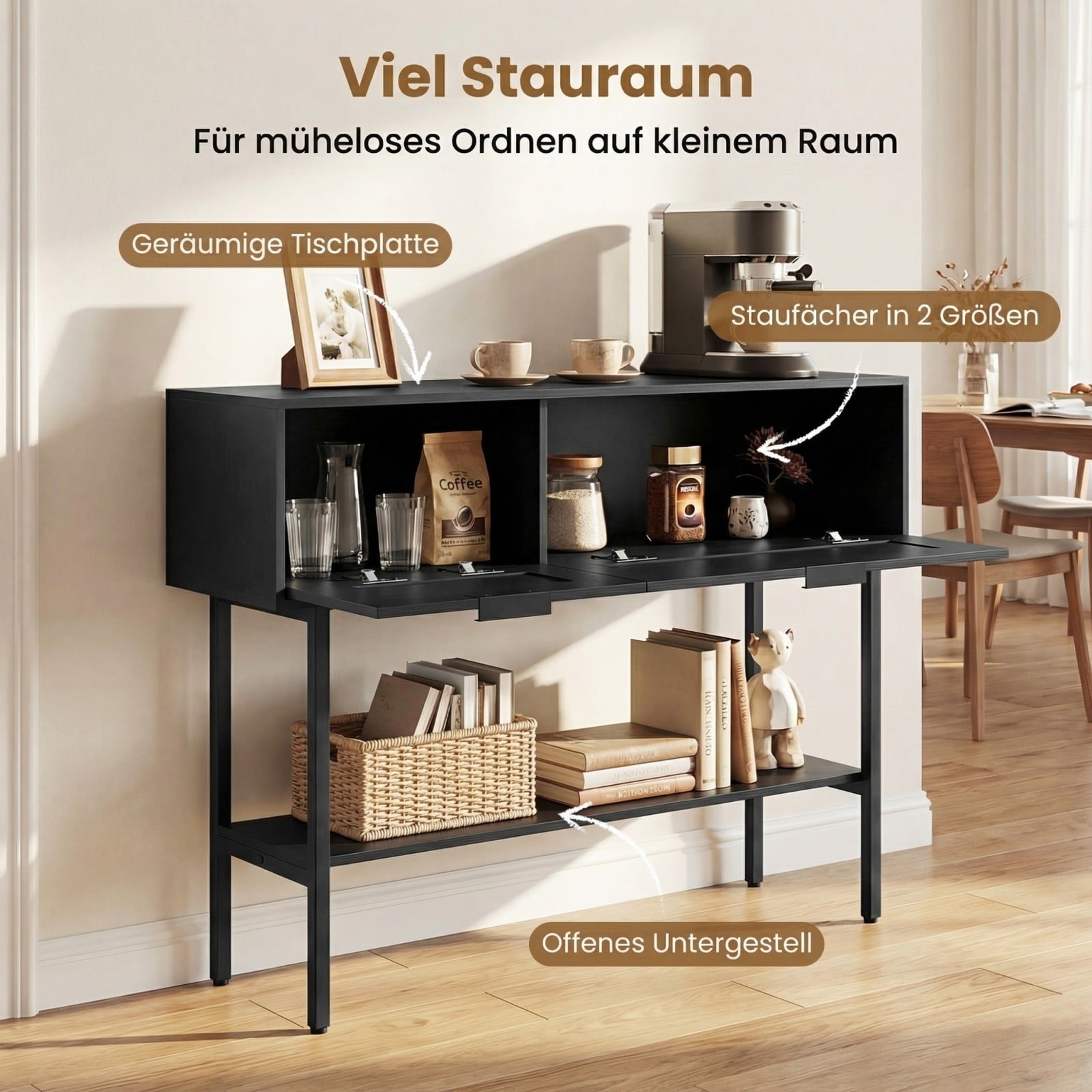 Siauras konsolinis staliukas su 2 uždaromais skyriais ir atvira lentyna (Juoda)