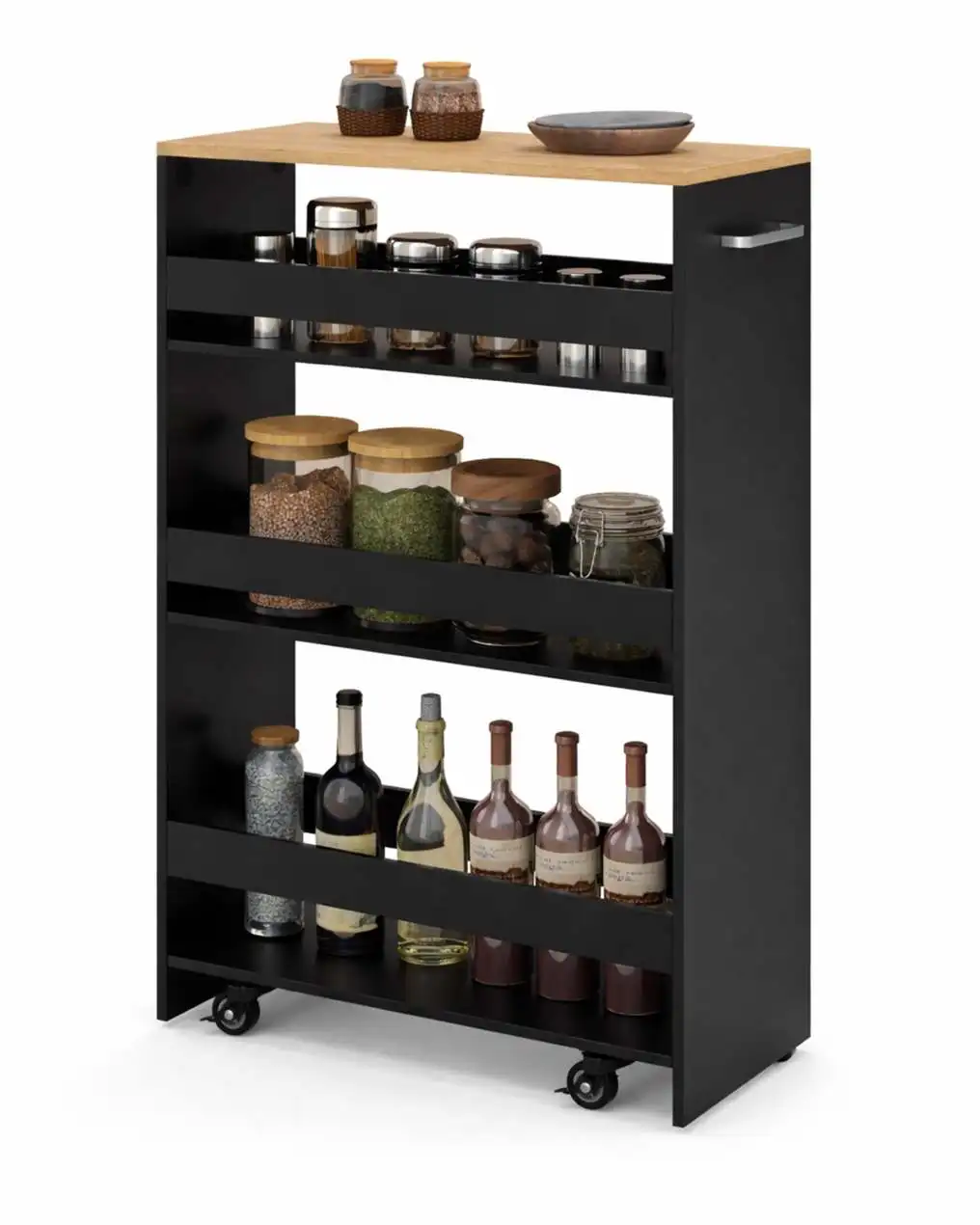- Erdvi keturių pakopų saugykla: Keturi atviri, skirtingo aukščio lentynų skyriai su apsauginiais turėklais užtikrina tvarkingą įvairių daiktų, nuo prieskonių iki buitinių reikmenų, laikymą.