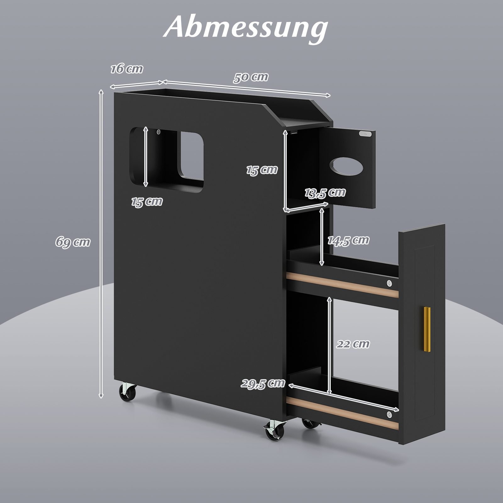 - Matmenys: 50 cm x 16 cm x 69 cm (Ilgis x Plotis x Aukštis)