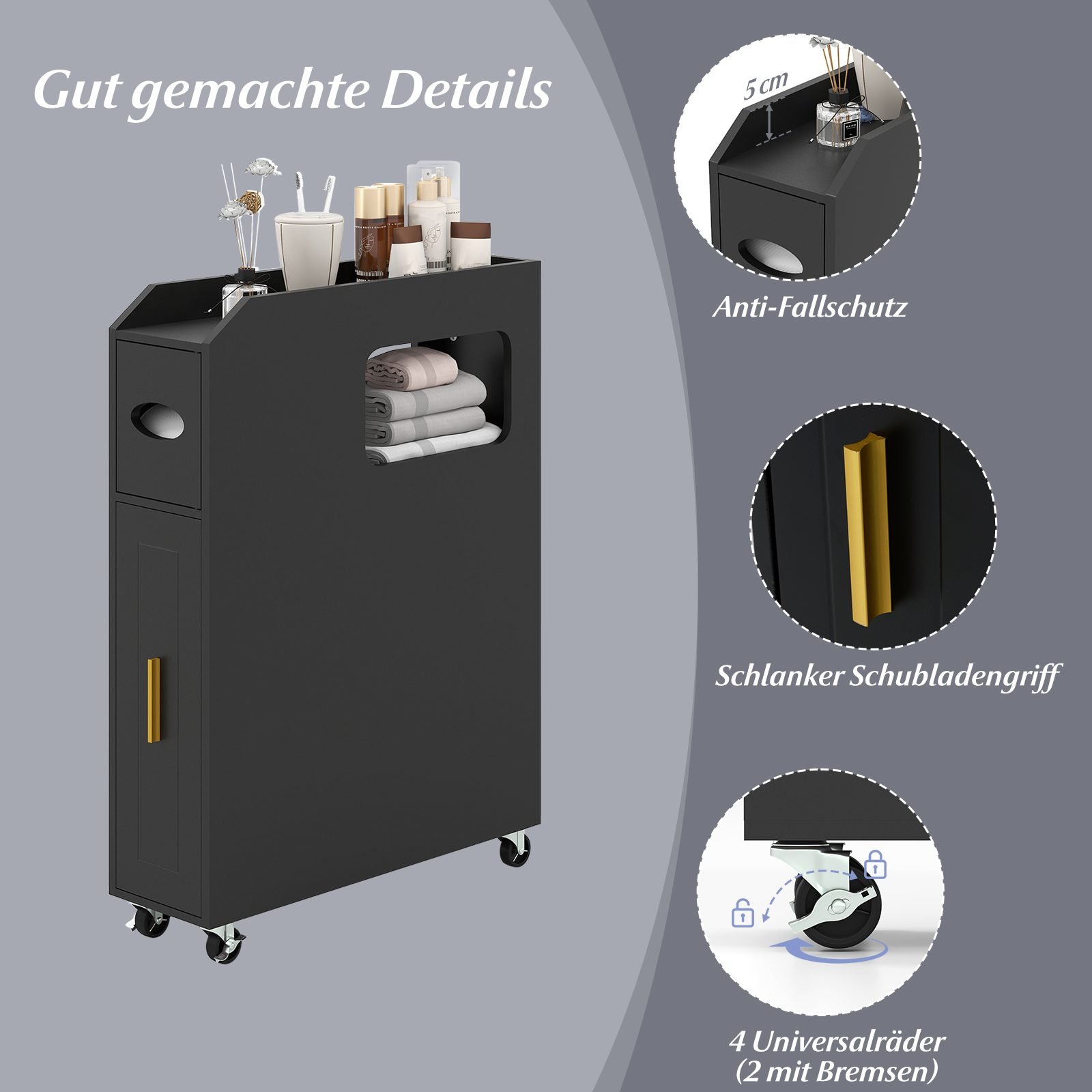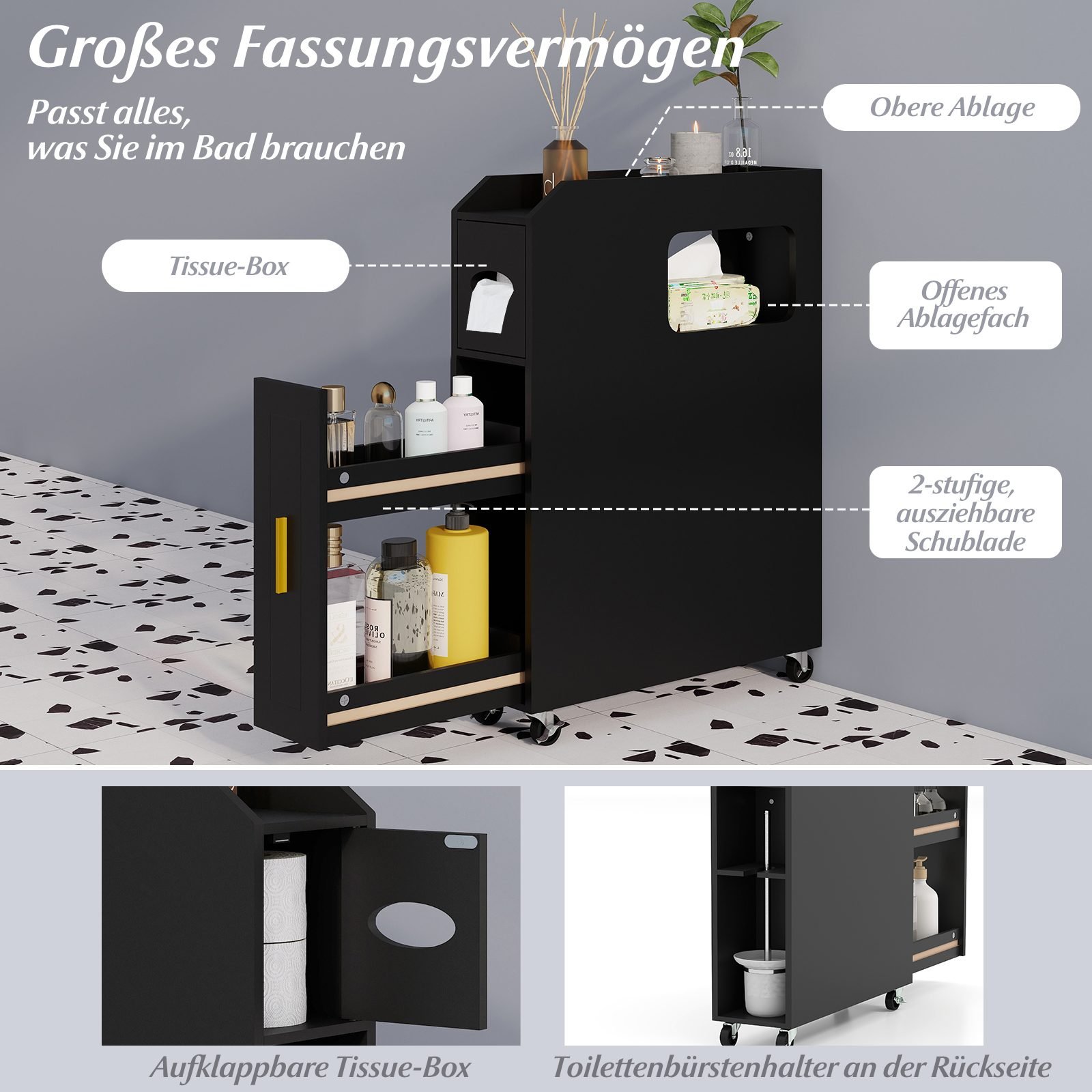 Siauras vonios organizatorius su stalčiumi ir tualetinio šepetėlio laikikliu (Juoda)