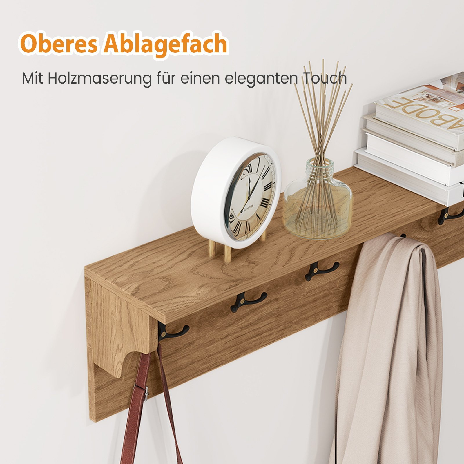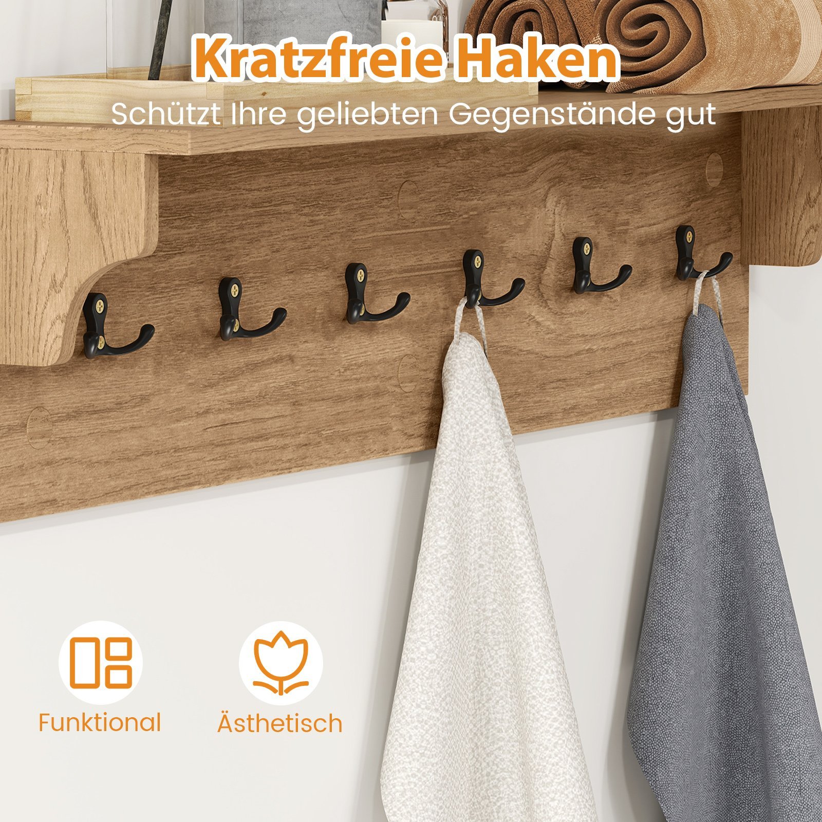 - Organizuotas daiktų laikymas: Viršutinė lentyna ir 6 kabliukai, užtikrinantys tvarkingą kepurių, rankšluosčių, krepšių ir chalatų laikymą.