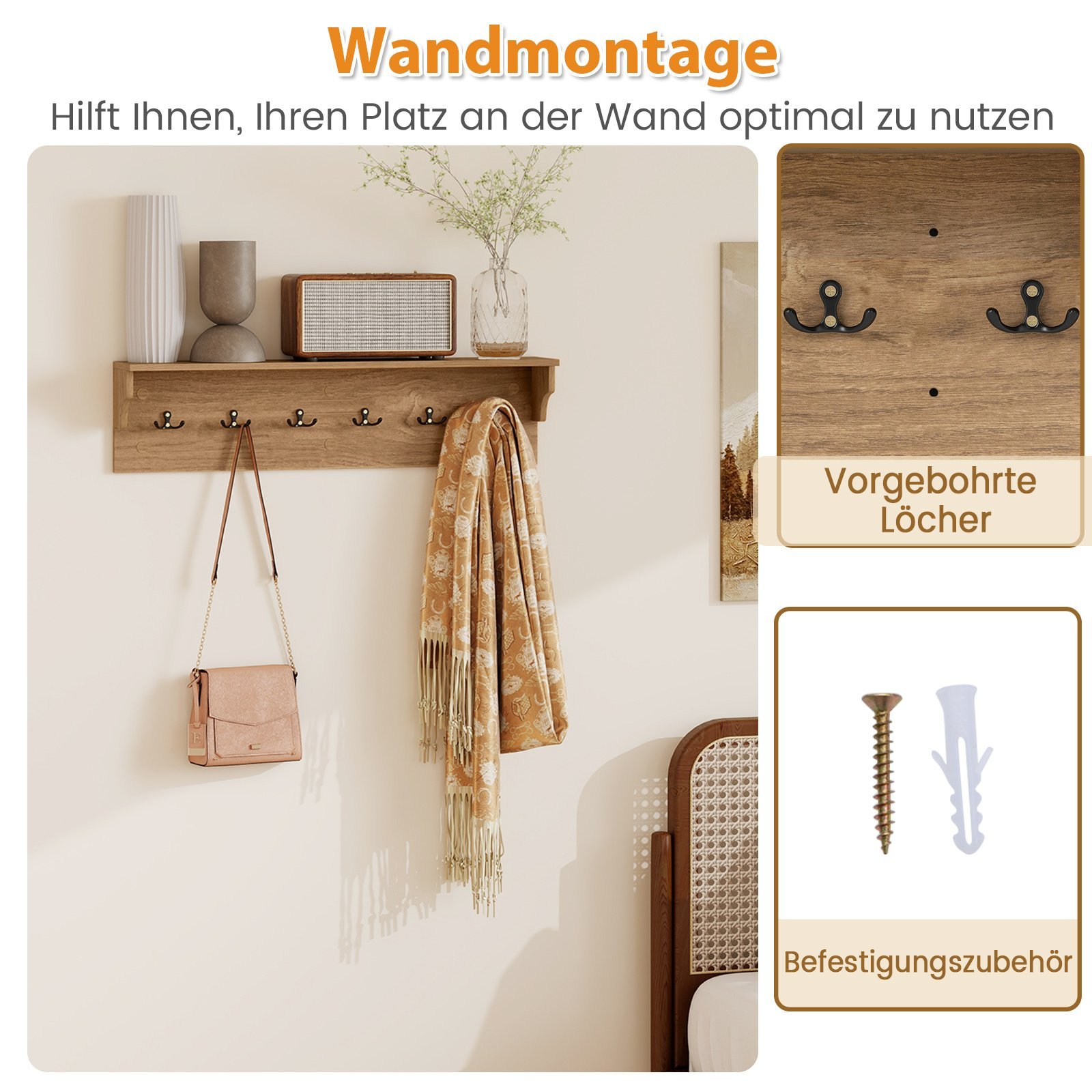 Sieninė kabykla su lentyna ir 6 kabliukais (Natūrali)