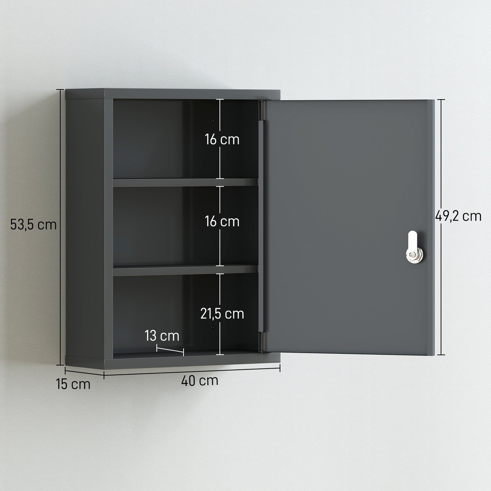 Lentynos matmenys: (iš viršaus į apačią) 40 x 13 x 16 cm (I x P x A), 40 x 13 x 16 cm (I x P x A), 40 x 13 x 21,5 cm (I x P x A)