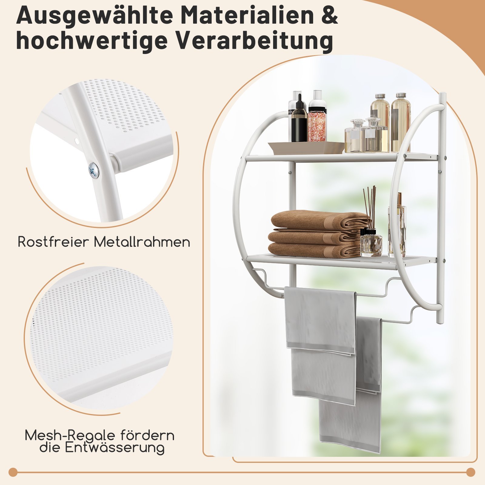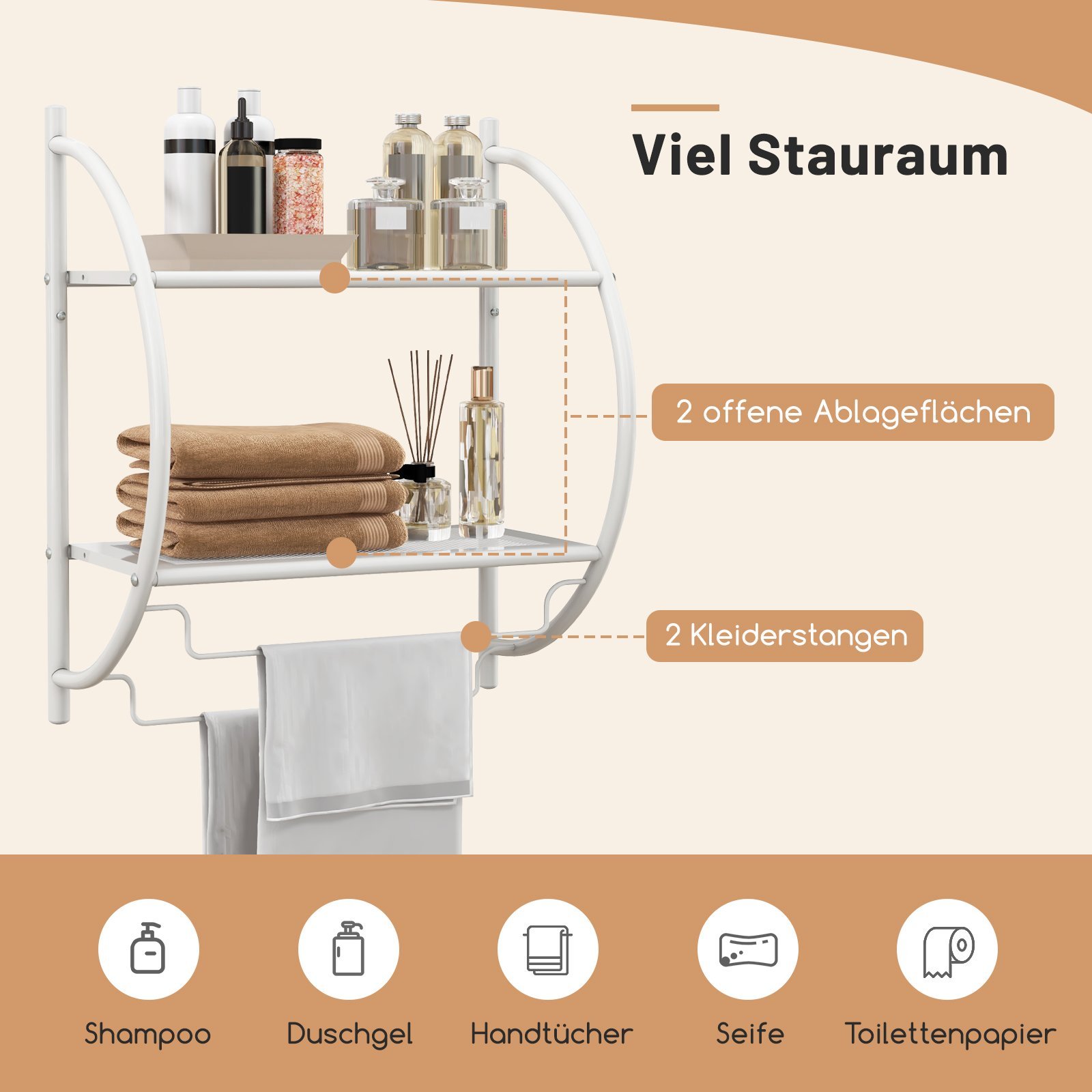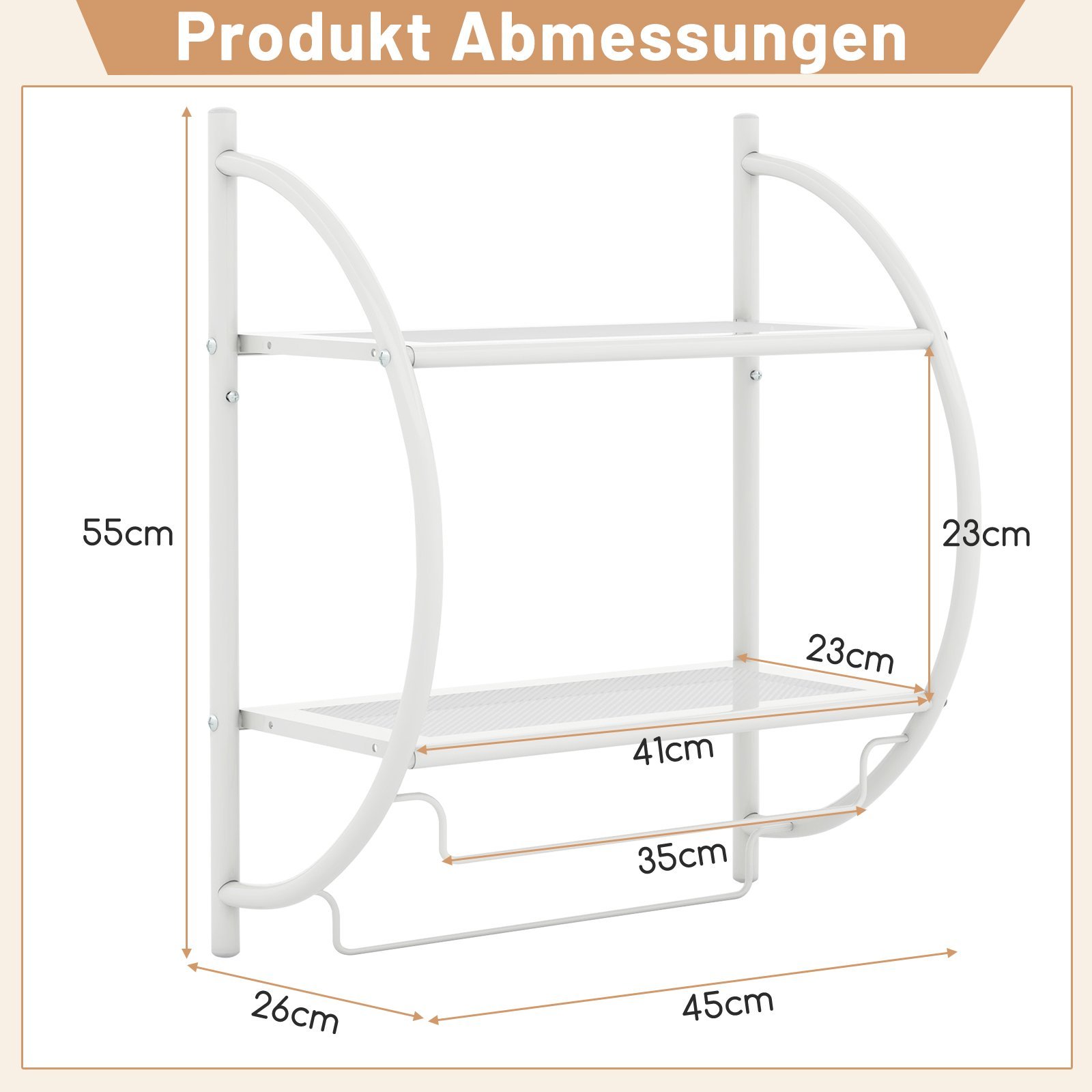 Sieninė metalinė vonios lentyna su rankšluosčių laikikliu (Balta)