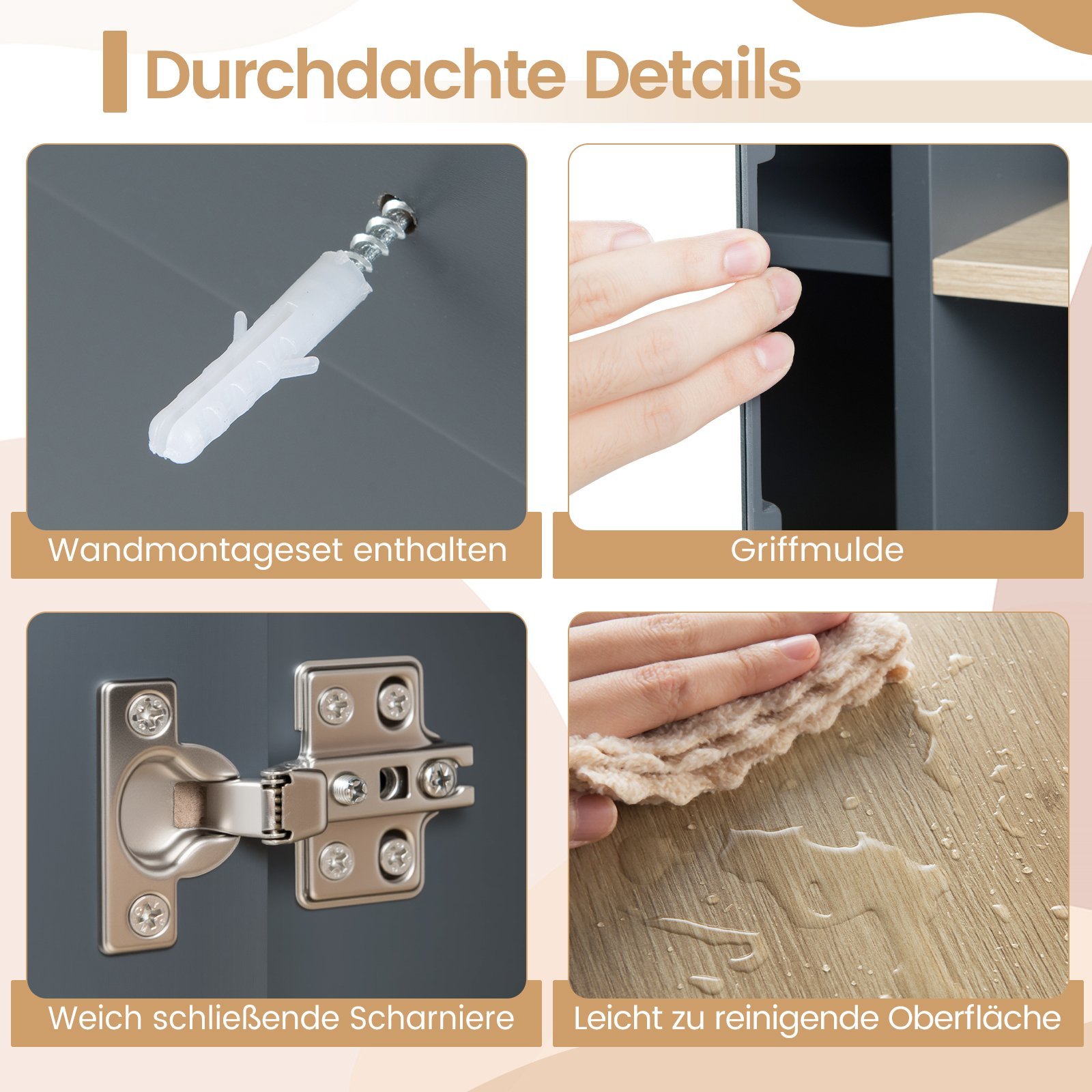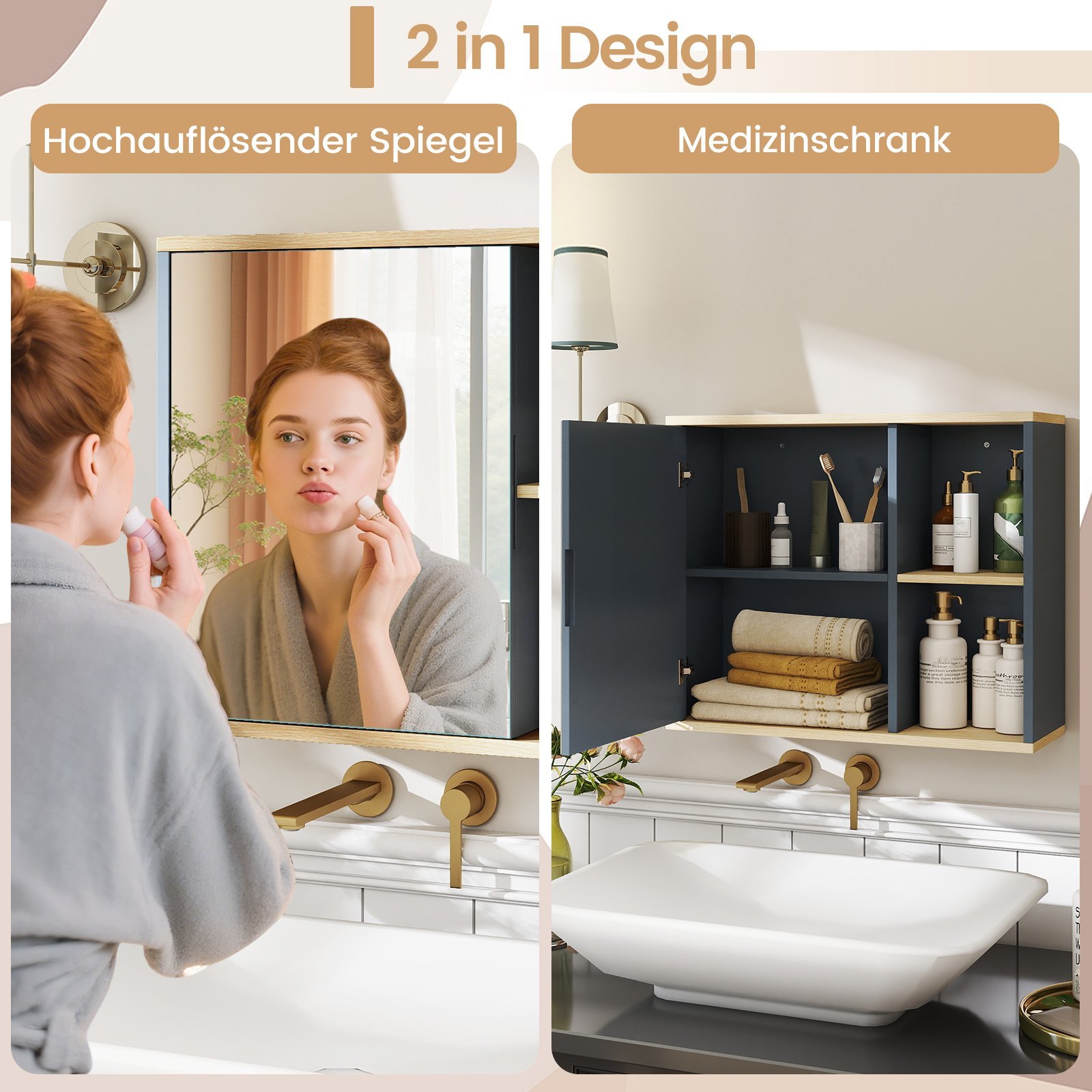 - Integruotas aukštos raiškos veidrodis ir patogūs švelnaus uždarymo vyriai.