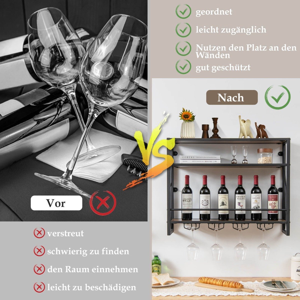 Atnaujinkite savo namų interjerą su šiuo stilingu ir funkcionaliu sieniniu vyno laikikliu. Pagamintas iš aukštos kokybės medžiagų, jis užtikrina ilgaamžiškumą ir stabilumą, suteikdamas jūsų vyno kolekcijai elegantišką eksponavimo vietą. Šis laikiklis – puikus sprendimas tiek mažam, tiek dideliam butelių kiekiui laikyti ir vizualiai patraukliai pateikti.