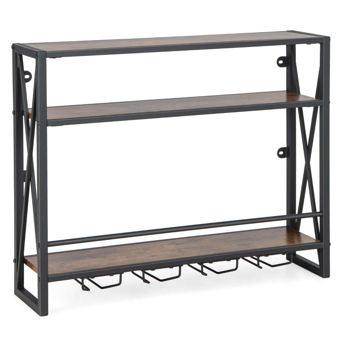 Sieninis vyno stovas su trimis lentynomis ir stiklinių laikikliu (Retro ruda)