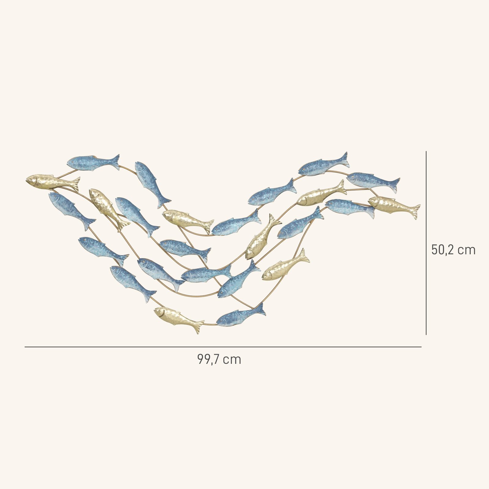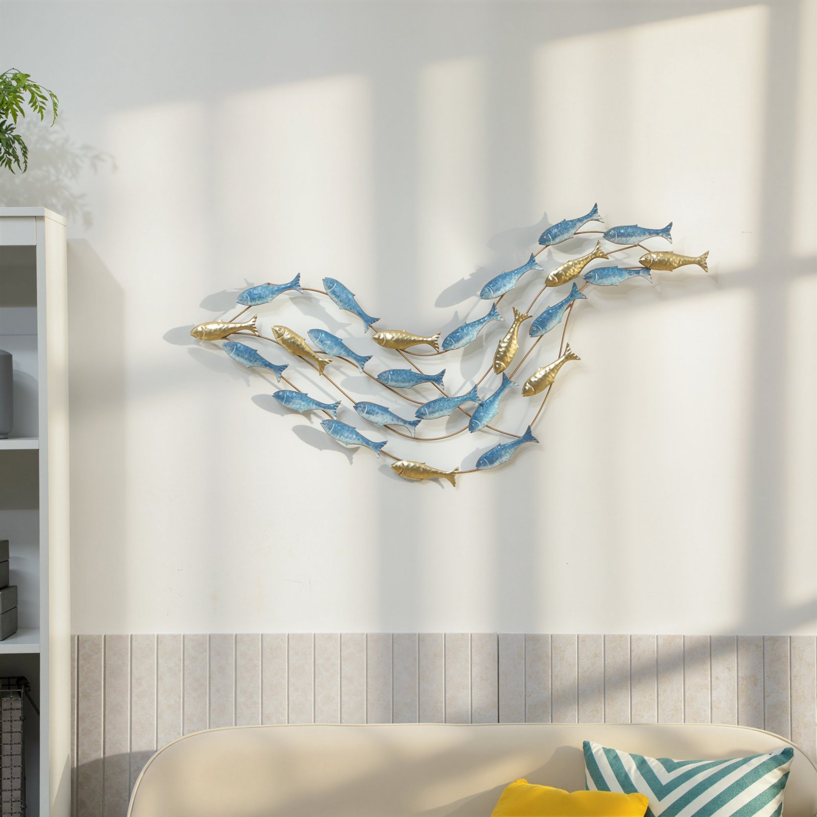 Tuščia, didelė sienos erdvė gali padaryti jūsų svetainę niūrią ir neįkvepiančią – prarasta galimybė asmeniniam tobulėjimui, dėl kurios kambarys atrodo kasdieniškas. Šis metalinis sieninis paveikslas paverčia šią tuščią erdvę patraukliu akcentu. Didelis, galerijos tipo formatas ir modernus dizainas su mėlynomis ir šviesiai auksinėmis žuvimis, išsidėsčiusiomis palei vingrias auksines linijas, suteikia gyvybingą ir elegantišką atmosferą, kuri užbaigia jūsų namų interjerą.