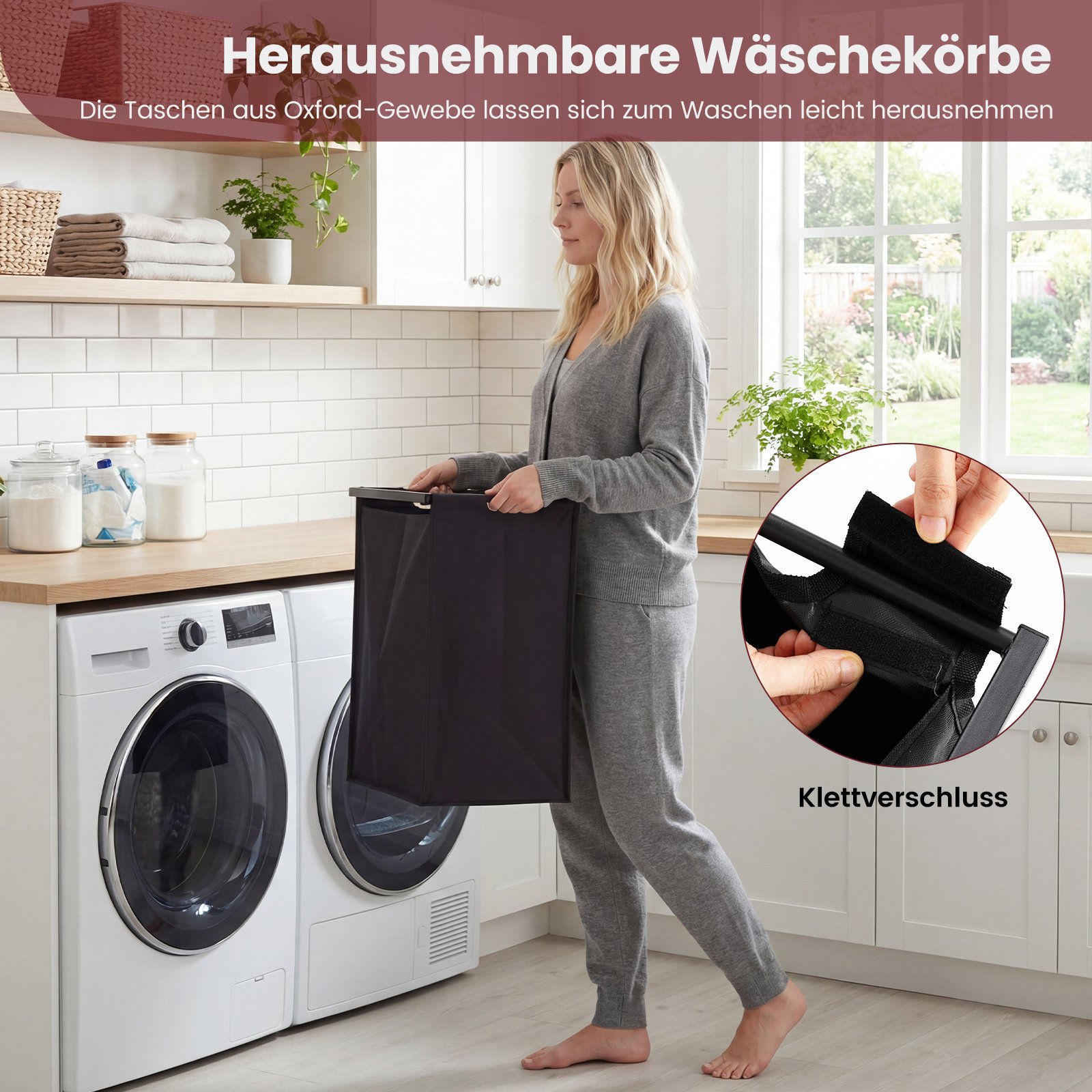 - Optimalus rūšiavimas: Trys atskiri, išimami krepšiai leidžia lengvai rūšiuoti skalbinius pagal spalvą ir tipą, supaprastinant skalbimo procesą.