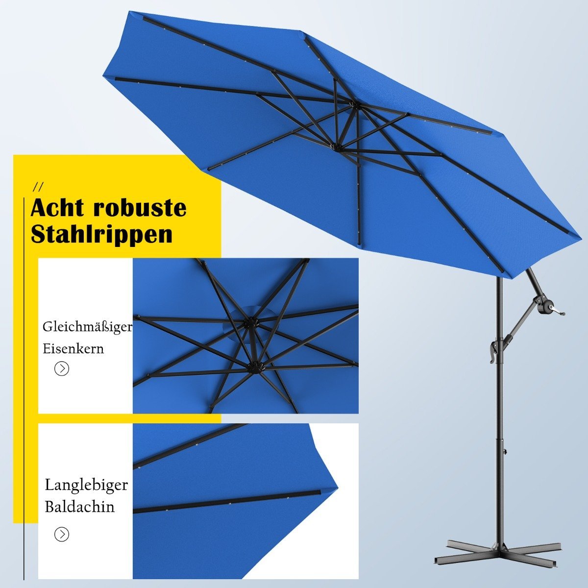 - Ø 300 cm skersmens skėtis suteikia didelį pavėsį, apsaugantį nuo saulės.