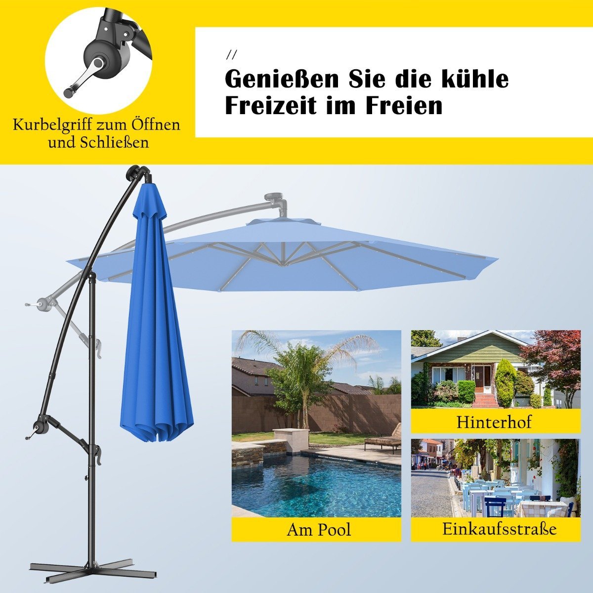 Pagerinkite savo lauko erdvės komfortą ir estetiką su šiuo universaliu lauko skėčiu. Sukurtas atlaikyti įvairias oro sąlygas, jis suteikia puikų pavėsį dieną ir sukuria jaukią atmosferą naktį su integruotu LED apšvietimu.