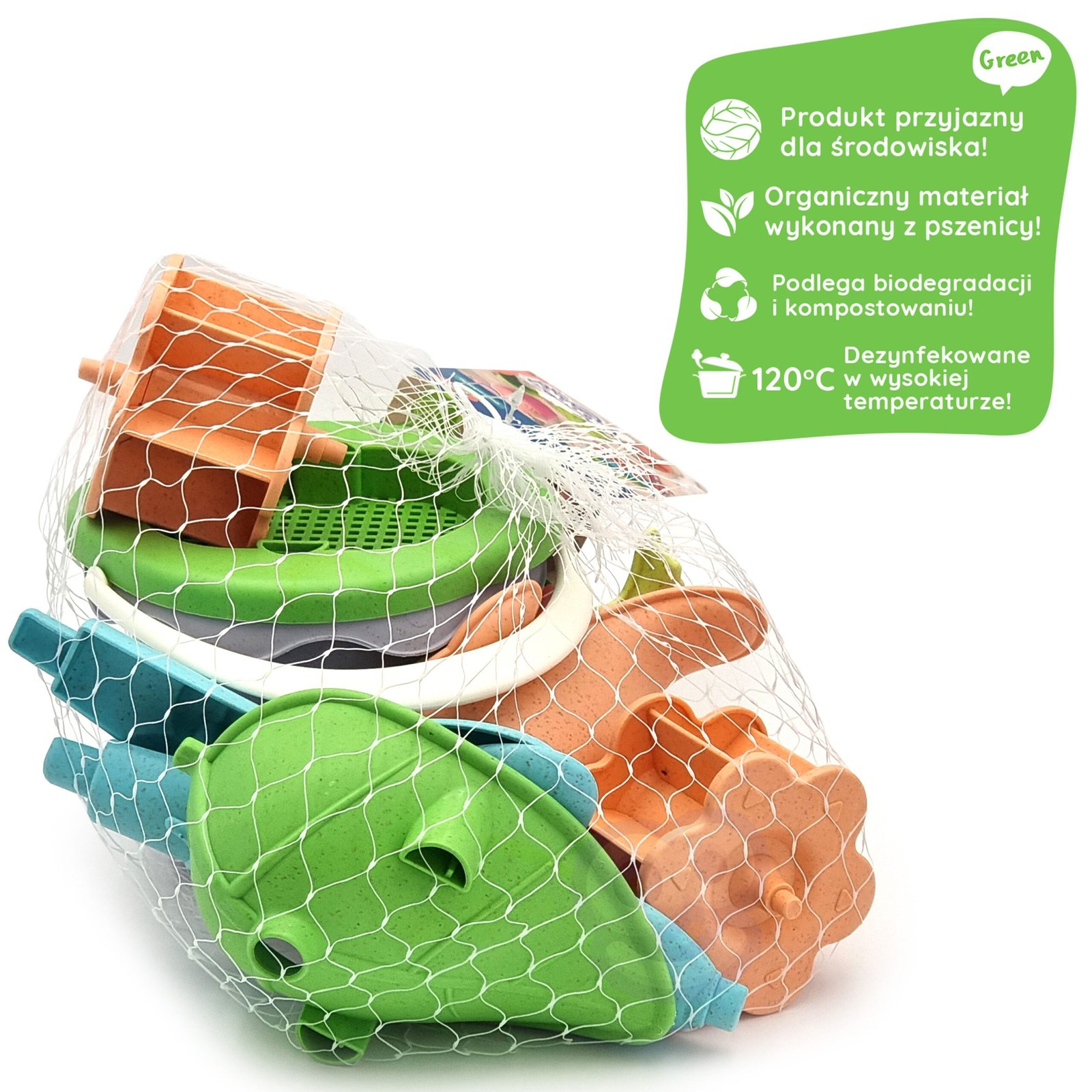 WOOPIE GREEN serijos smėlio rinkinys su kibirėliu ir smėlio malūnėliu puikiai tinka žaidimams smėlio dėžėje, paplūdimyje ar sode. Rinkinį sudaro keturi elementai: kibirėlis, smėlio malūnėlis ir dvi formelės. Kibirėlis turi patogią rankeną, kad jį būtų lengva nešti. Šis rinkinys pasižymi madingomis pastelinėmis spalvomis ir yra pagamintas iš organinės, biologiškai skaidžios medžiagos, kuri natūraliai suyra. Jis yra kompostuojamas ir saugus vaikams, dezinfekuotas 120 °C temperatūroje.