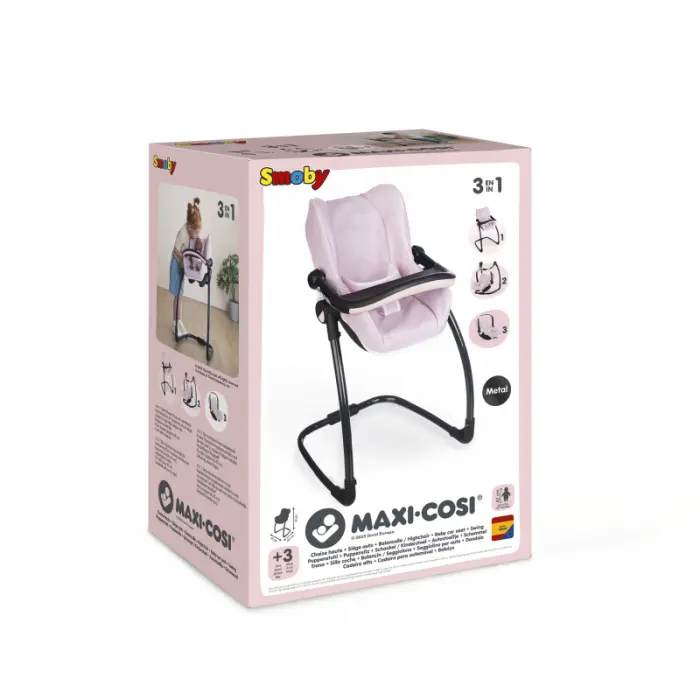 SMOBY lėlės nešioklė, maitinimo kėdutė ir supynė Maxi Cosi skirta lėlytėms kurių dydis iki 42 cm. Iš nešioklės ir vieno rėmo galima sukonstruoti supynes ir maitinimo kėdutę. Nešioklę galima naudoti kaip gultuką ar automobilinę kėdutę.
