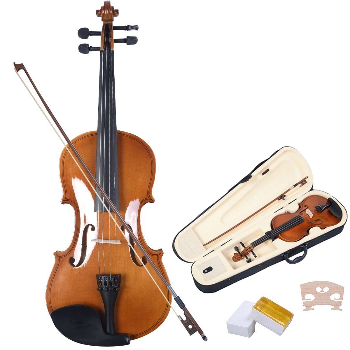 - Pilnas priedų komplektas: Visi būtini priedai, tokie kaip strykas, kanifolija ir tiltelis, yra komplekte.