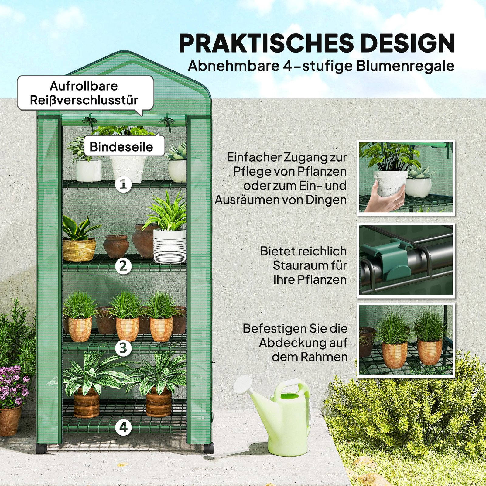 Užtikrintai pradėkite naujus sodo metus: Mini šiltnamis, pasižymintis kompaktiškais matmenimis, siūlo daug vietos. Ant šiltnamio augalų lentynų su keturiais skyriais (aukštis kiekvienam skyriui 33 cm, kiekvienas atlaiko maks. 15 kg) jūsų augalai ras saugią erdvę. Šiltnamio pagrindas ir apatinis rėmas pagaminti iš milteliniu būdu dengto plieninio vamzdžio, todėl yra atsparūs oro sąlygoms ir stabilūs.
