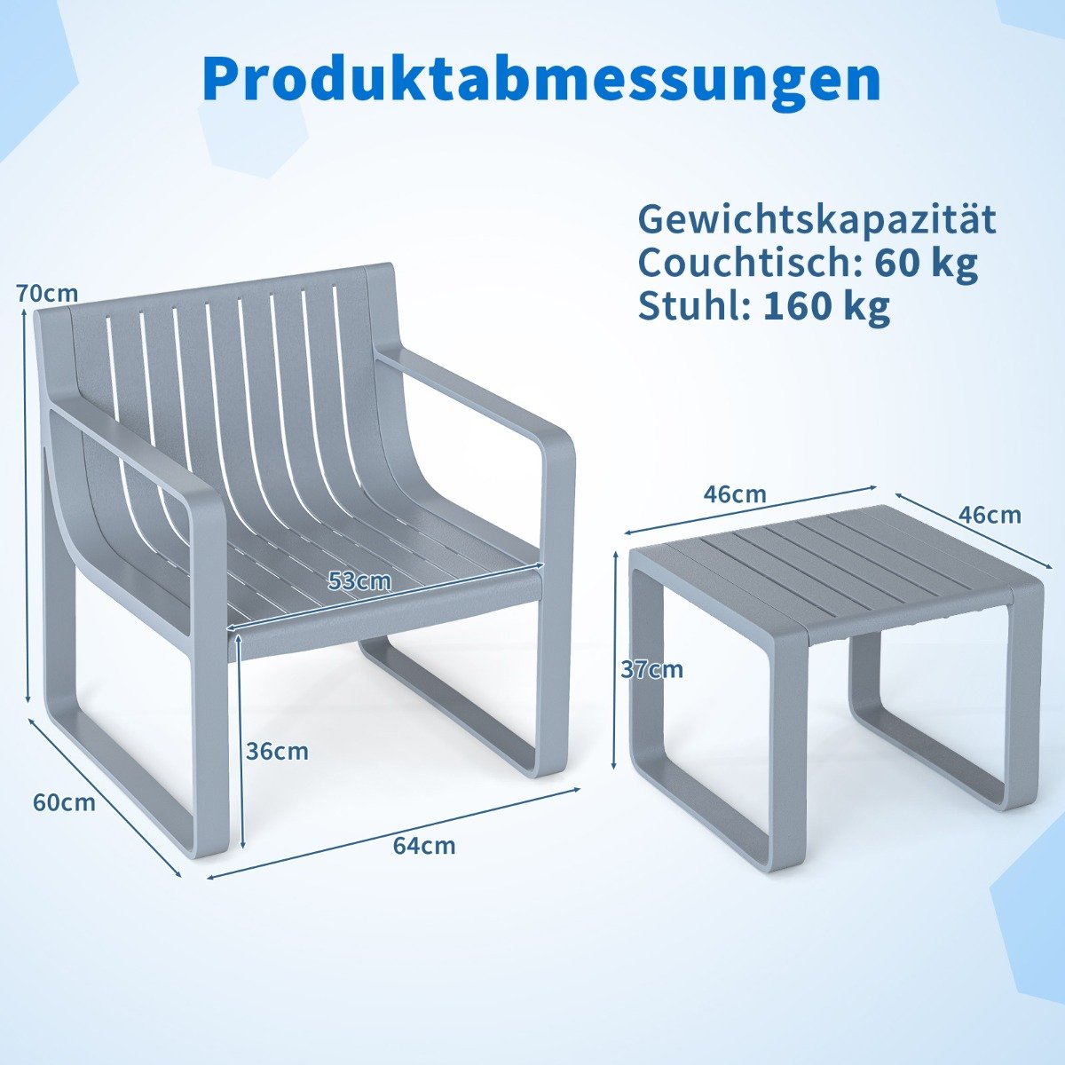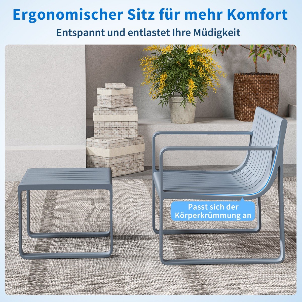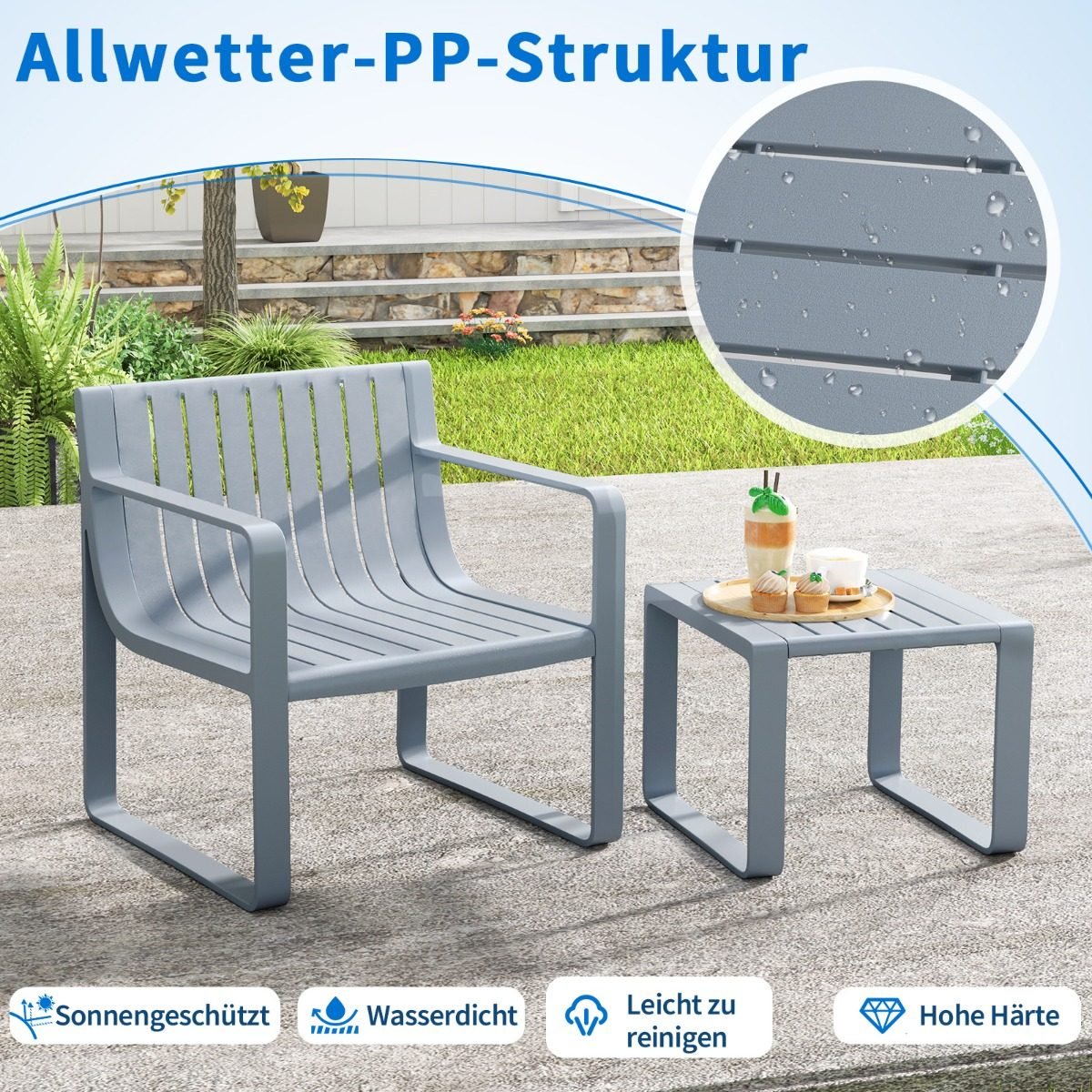 Atnaujinkite savo lauko erdvę su šiuo stilingu ir funkcionaliu 2-vietų sodo baldų komplektu. Pagamintas iš aukštos kokybės polipropileno, šis komplektas pasižymi ilgaamžiškumu ir atsparumu įvairioms oro sąlygoms.
