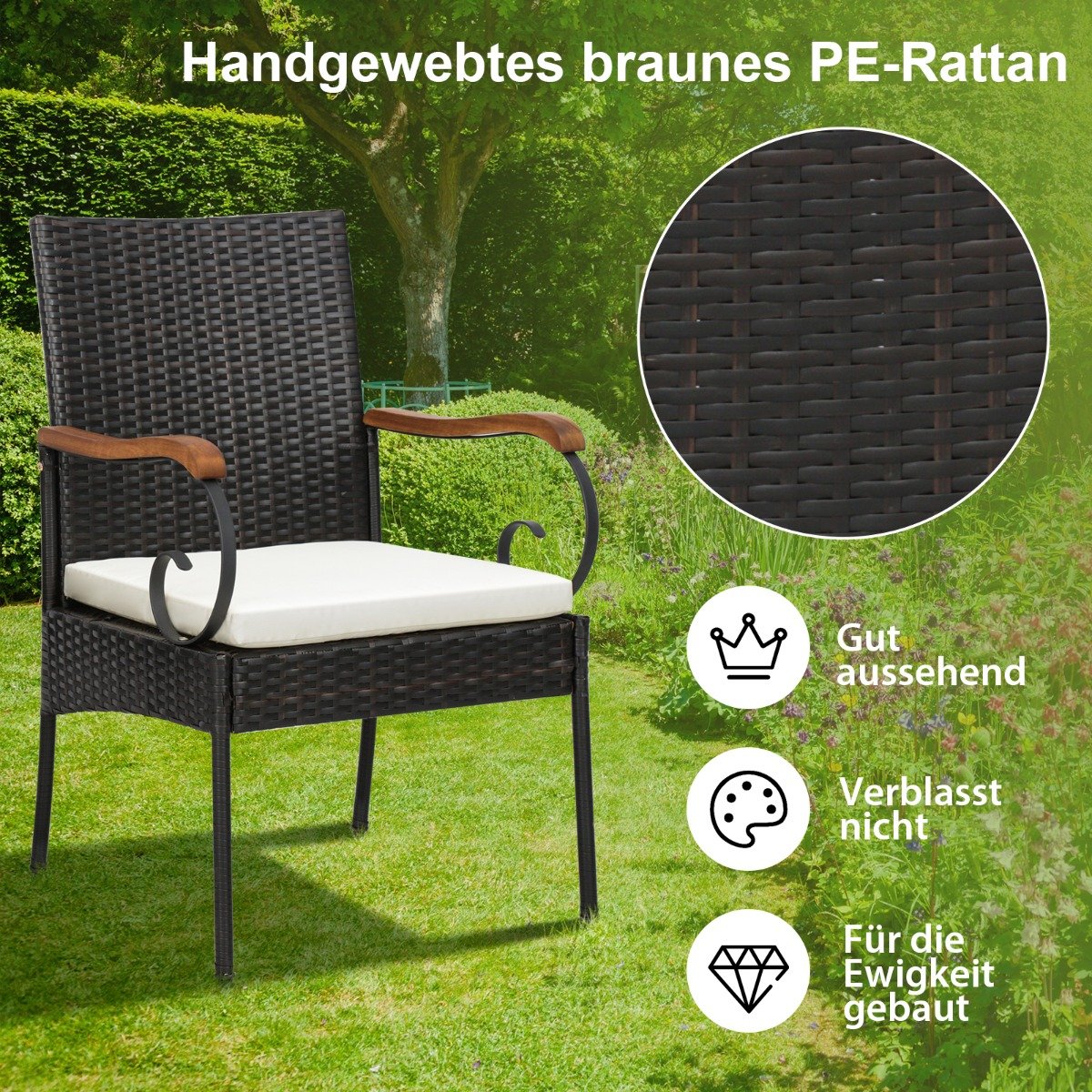- Aukštos kokybės, rankomis austas PE rotango pynimas yra atsparus UV spinduliams ir ilgaamžis.