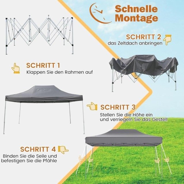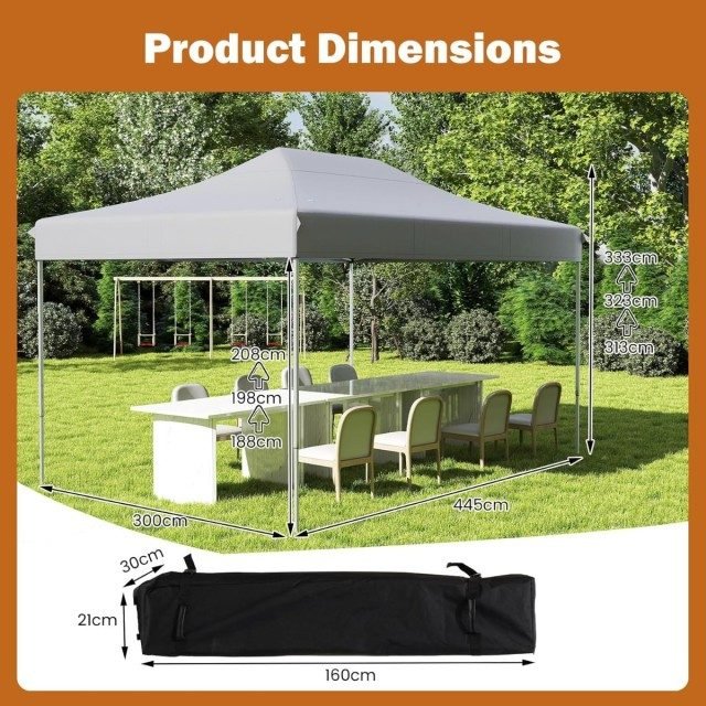 Sukurkite nepamirštamą renginio atmosferą su šia akimirksniu pastatoma pavėsine! Šis 300 x 445 cm dydžio komercinis stogelis suteikia daug erdvės lauko vakarėliams ar renginiams. Turint 3 skirtingus aukščio nustatymus, šią lengvai pastatomą pavėsinę galite pritaikyti pagal savo poreikius.