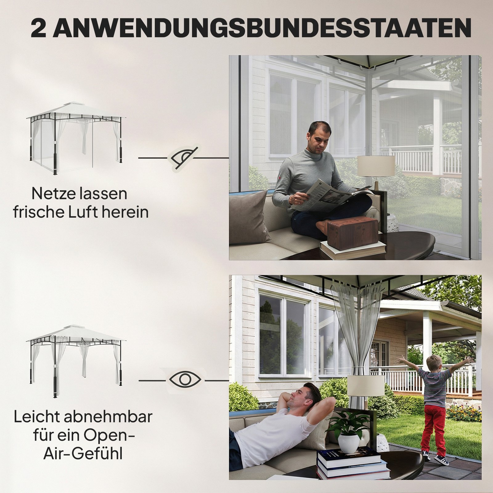 ✔ Užtrauktuku užsegamas tinklelis nuo uodų visose šio paviljono pusėse apsaugo nuo vabzdžių ir leidžia cirkuliuoti orui.